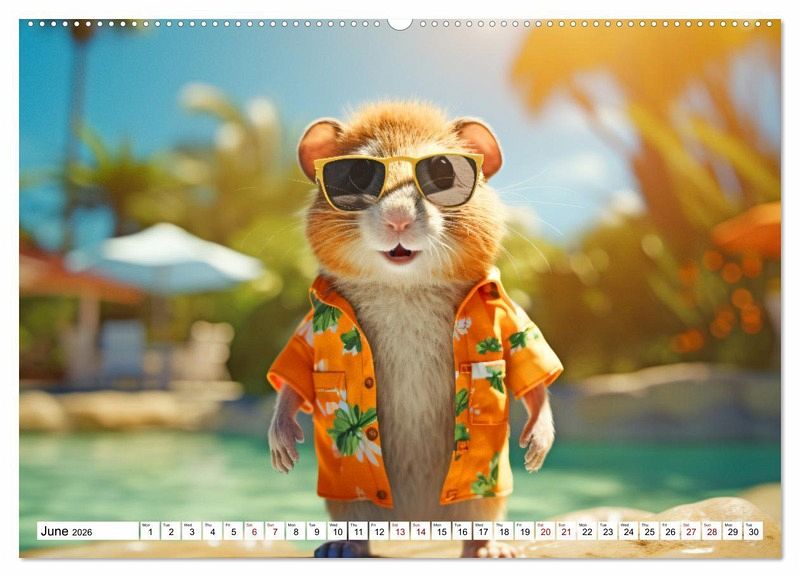 For you, the whole year could be summer and in addition you love animals. Then this wall calendar is just right for you. Every month you'll find a magical AI generated photo of an animal having fun in the warm season. Whether it's a polar bear, hamster, goat or alpaca - you'll find them all here. See them splashing in the water, frolicking in the sand or lolling in the sun and be infected by their good mood. This wall calendar makes a great gift for yourself or your loved ones. Order it now and ensure yourself a year full of sunny snapshots with good-humored animals.