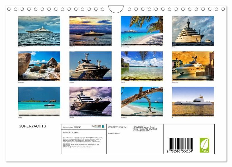 QUALITY - High-quality photo calendar with 12 beautiful images on light-resistant paper, robust spiral binding with hanger.SUSTAINABLE - Significant waste reduction due to print-on-demand production, environmentally friendly FSC-certified paper, produced in the UK, climate-conscious logistical processes.PERFECT GIFT - calendars for friends and family, for children, all ages and all occasions, from Christmas to birthdays and everything in between.LOTS OF CHOICE - Wall calendars in different sizes (DIN A4 and DIN A3), for any topic and personal taste, featuring photography, painting and illustrations.A collection of amazing superyachts from around the world in beautiful locations., author: Mark O'Connell