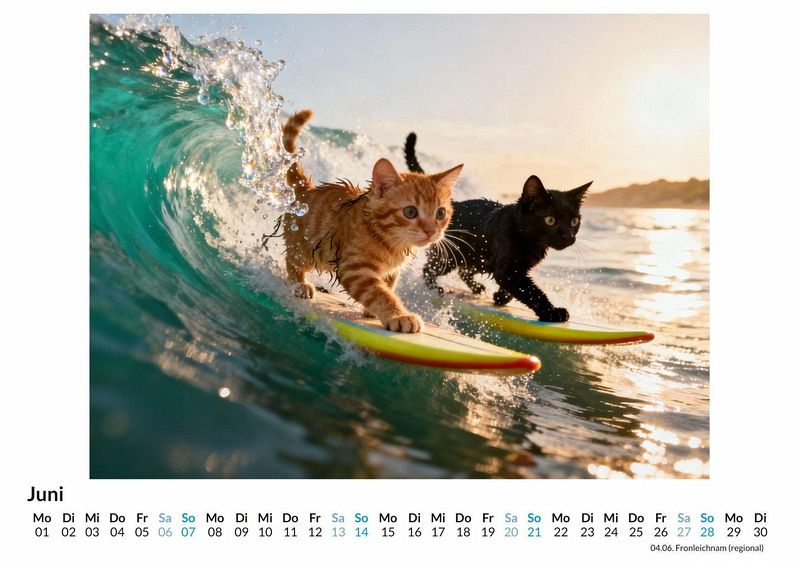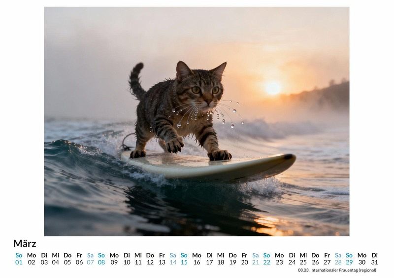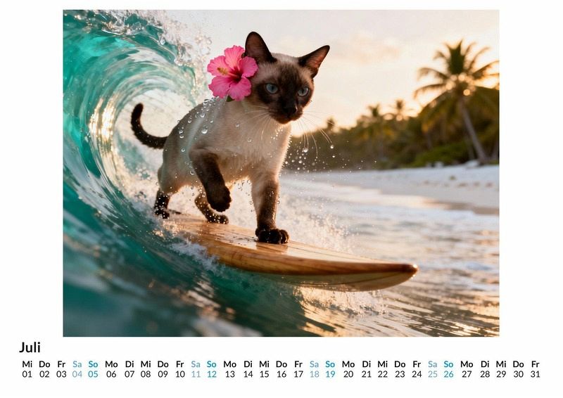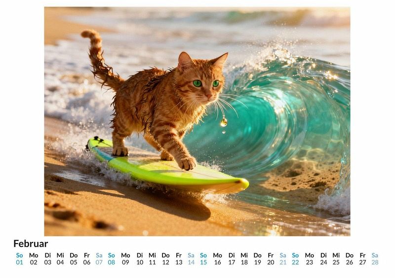 Eine Welle bricht, Salzwasser spritzt, ein kleines Surfbrett gleitet über das Wasser und darauf balanciert... eine Katze in voller Konzentration. Der Kalender "Surfende Katzen" fängt eine Realität ein, die es eigentlich nicht geben dürfte. Er präsentiert zwölf Monate voller absurder Szenen, in denen Samtpfoten zu Wellenreitern werden, mal elegant, mal kurz vor dem unfreiwilligen Bad. Der Kalender ist die perfekte Wahl: Für Menschen mit einer Vorliebe für Katzen und absurden Humor. Als originelles Geschenk, das garantiert für Gesprächsstoff sorgt. Für jeden, der seinen Alltag mit einem monatlichen Schmunzeln bereichern möchte. Jeder Monat enthüllt ein neues, detailreiches Bild. Mal blickt eine flauschige Perserkatze mit panisch aufgerissenen Augen auf die kommende Welle, mal posiert ein schlanker Kater mit stolz geschwellter Brust auf seinem Brett, als hätte er nie etwas anderes getan. Diese Fotografien, durch die kreative Kraft von Algorithmen zum Leben erweckt, fangen die unmögliche Anmut und die komische Dramatik dieser Situationen ein. Was dieser Kalender bietet: Zwölf einzigartige Monatsmotive von surfenden Katzen. Ein übersichtliches Kalendarium für die Organisation von Terminen. Ein Jahr voller skurriler Momente, die zum Lächeln anregen. Der Kalender "Surfende Katzen" ist mehr als nur ein Zeitplaner. Er ist eine monatliche Dosis Heiterkeit und eine Einladung, die Welt für einen Moment nicht ganz so ernst zu nehmen. Eine Hommage an die Fantasie und die komische Würde unserer vierbeinigen Freunde. Es lohnt sich, einen Blick auf diese kuriosen Wellenreiter zu werfen.