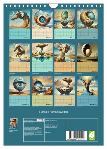 Entdecke Welten jenseits der Realität. Erlebe eine Mischung aus Traum und Fantasie, in der die Grenzen des Vorstellbaren verschwimmen. Inspiriert von den großen Meistern des Surrealismus, entführen dich die mithilfe von KI erstellen Bilder von Renate Utz jeden Monat auf eine fantastische Reise in eine andere Dimension des Unbewussten. Habe den Mut, die Grenzen des Realen zu überschreiten und lass dich von der Magie der oft skurrilen Darstellungen begeistern. Das ideale Geschenk für alle Freunde surrealistischer Bilder und fantastischer Traumwelten.