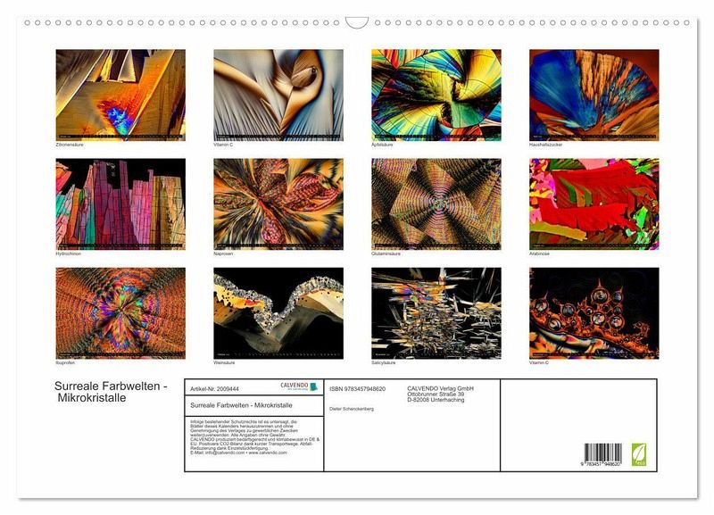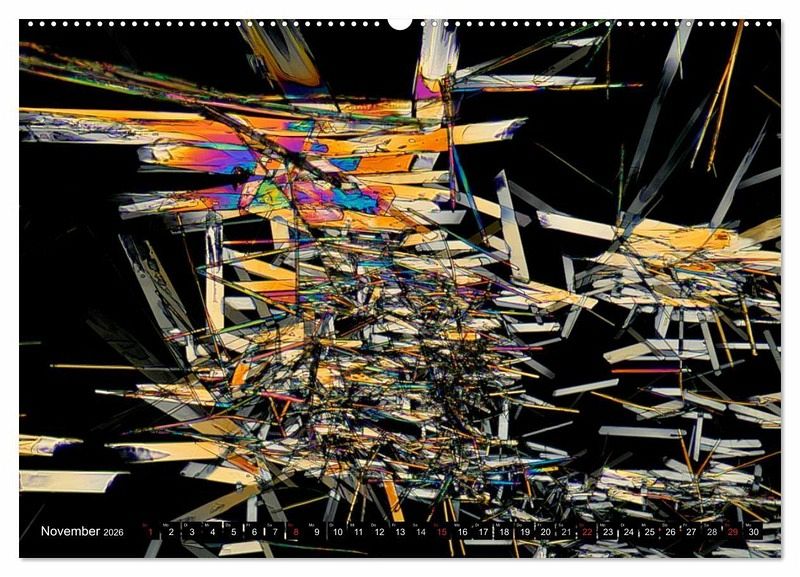 Verborgen in den inneren Strukturen der Kristalle liegt eine phantastische Formenwelt in schillernden Farben, die sich dem Betrachter unter dem Mikroskop im polarisierten Licht erschließt. Mikrofotografien vertrauter Substanzen wie Zucker, Vitamin C oder Weinsäure offenbaren dem Staunenden über das Jahr ihre surreale faszinierende Pracht.