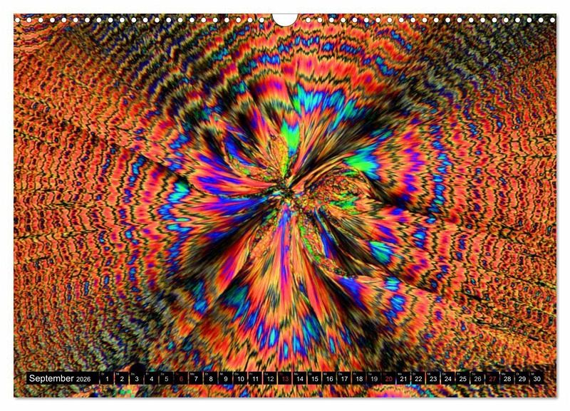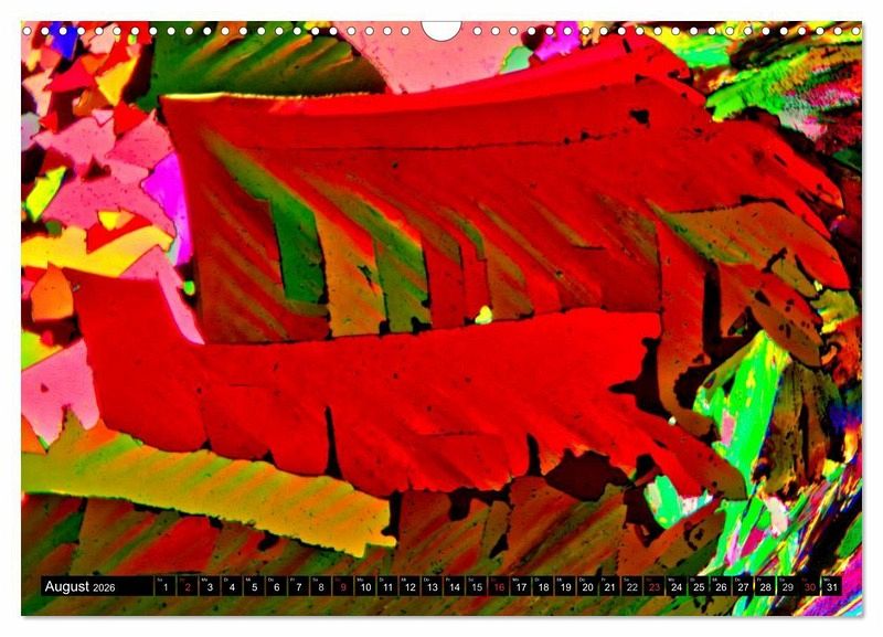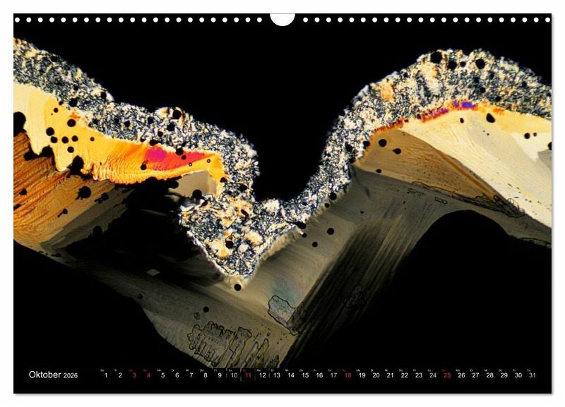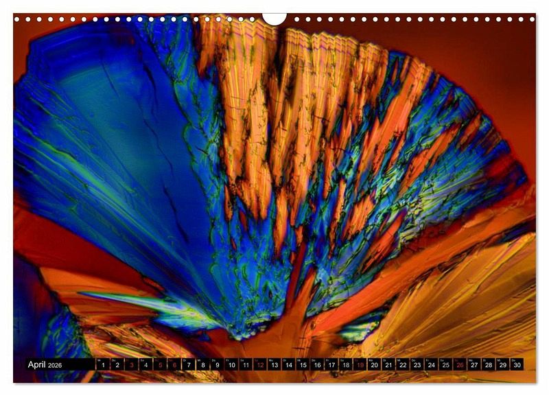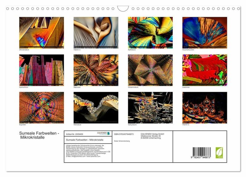 Verborgen in den inneren Strukturen der Kristalle liegt eine phantastische Formenwelt in schillernden Farben, die sich dem Betrachter unter dem Mikroskop im polarisierten Licht erschließt. Mikrofotografien vertrauter Substanzen wie Zucker, Vitamin C oder Weinsäure offenbaren dem Staunenden über das Jahr ihre surreale faszinierende Pracht.