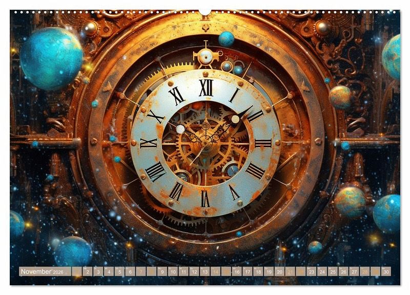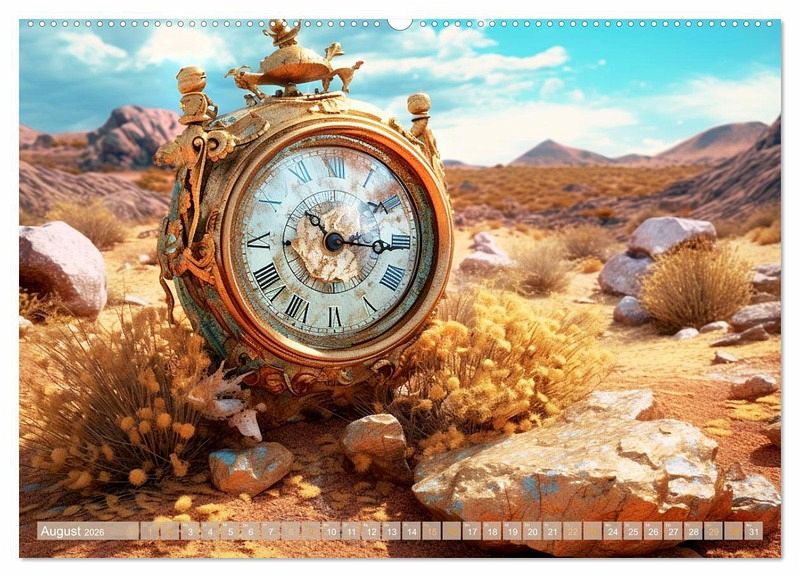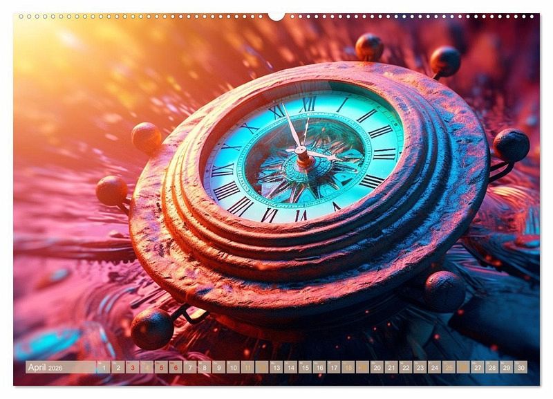 Fantasie und Surrealismus vereint mit verschiedenen Zeitmessern in fantastischen Farben und Formen machen diesen Kalender jeden Monat von Neuem zu einem kleinen einzigartigen Kunstwerk. Die Bilder wurden von einer künstlichen Intelligenz erstellt und sind nicht nur der Hingucker an deiner Wand zu Hause oder im Büro, sondern werden Dich vielleicht auch selbst dazu anregen, auf eine fantastische Zeitreise zu gehen.