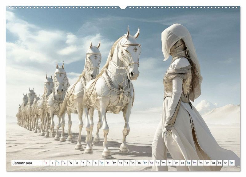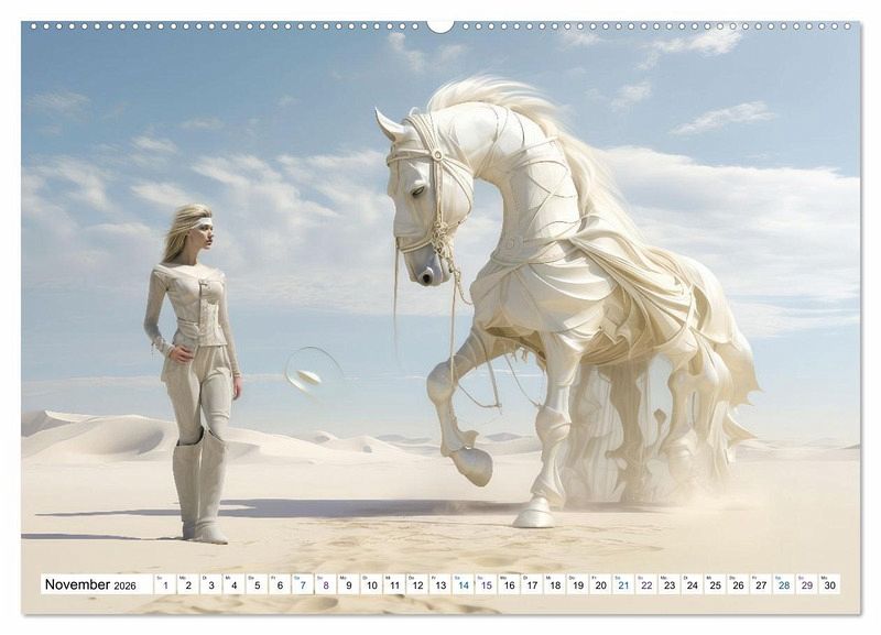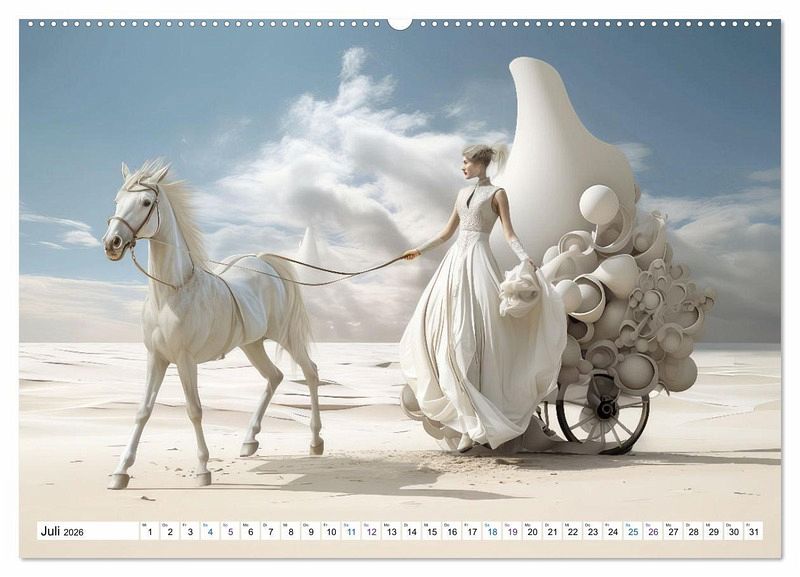 Dieser Kalender entführt uns in eine faszinierende Welt, in der Surrealismus und Pferde aufeinandertreffen. Die Szenerie ist in hellen beigen und weißen Farbtönen gehalten, die Himmel sind lichtvoll pastellblau.