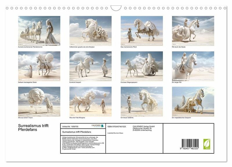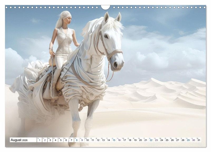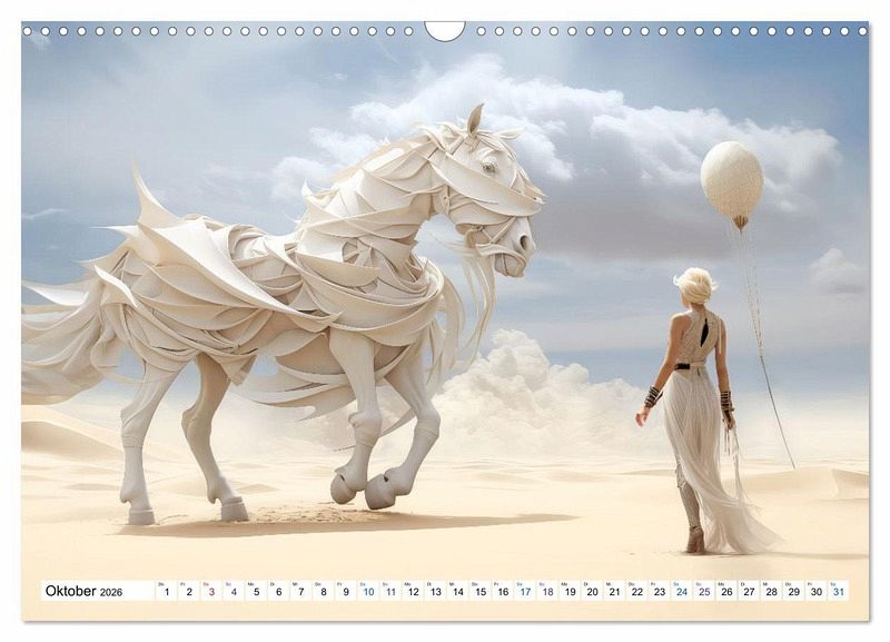 Dieser Kalender entführt uns in eine faszinierende Welt, in der Surrealismus und Pferde aufeinandertreffen. Die Szenerie ist in hellen beigen und weißen Farbtönen gehalten, die Himmel sind lichtvoll pastellblau.