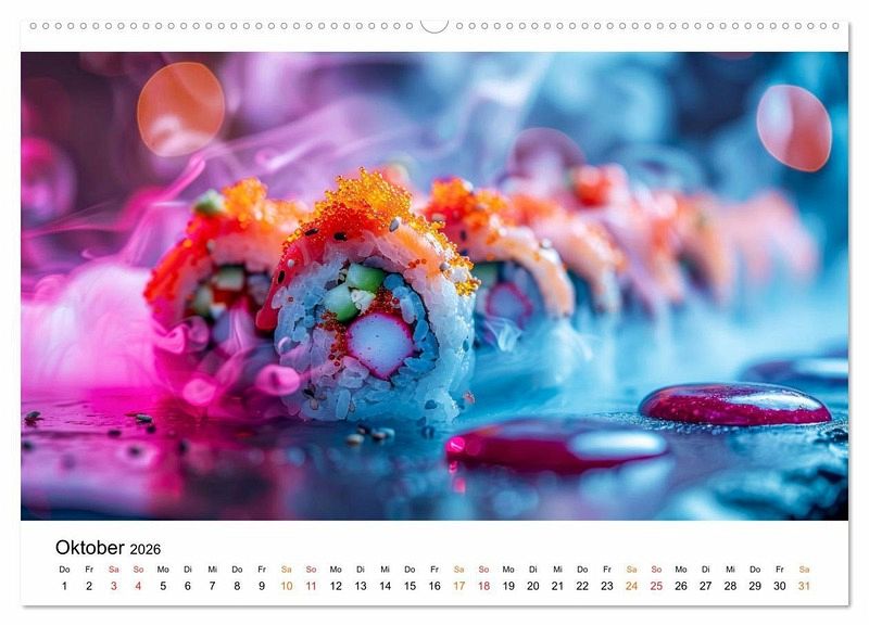 Erleben Sie die Kunst des Sushi mit diesem kulinarischem Kalender. Jeder Monat zeigt atemberaubende Fotos von sorgfältig hergestelltem Sushi. Bestaunen Sie die leuchtenden Farben und exquisiten Details von Nigiri und Maki.