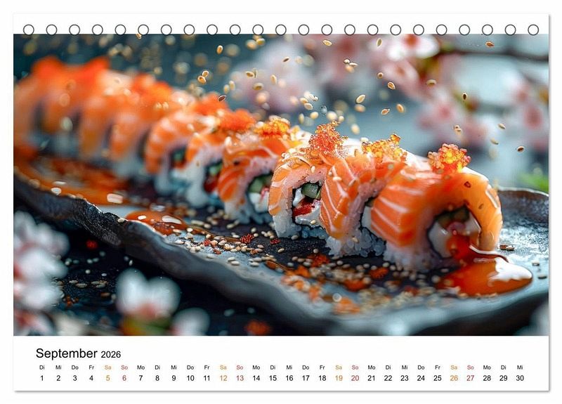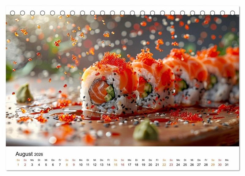 Erleben Sie die Kunst des Sushi mit diesem kulinarischem Kalender. Jeder Monat zeigt atemberaubende Fotos von sorgfältig hergestelltem Sushi. Bestaunen Sie die leuchtenden Farben und exquisiten Details von Nigiri und Maki.