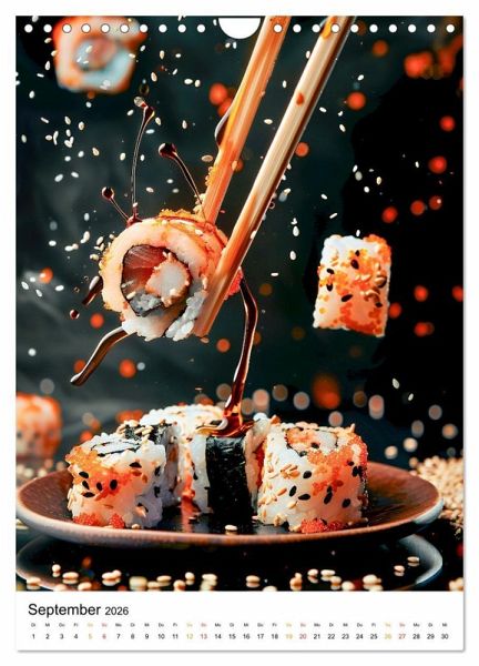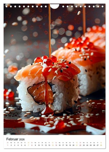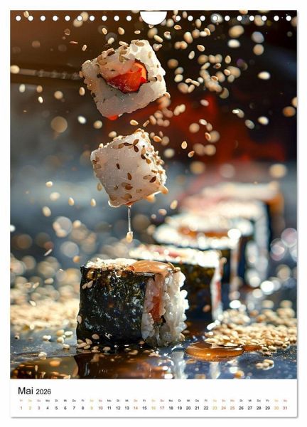 Erleben Sie die Kunst des Sushi mit diesem kulinarischem Sushi Kalender. Jeder Monat zeigt atemberaubende Fotos von sorgfältig hergestelltem Sushi. Bestaunen Sie die leuchtenden Farben und exquisiten Details von Nigiri und Maki.