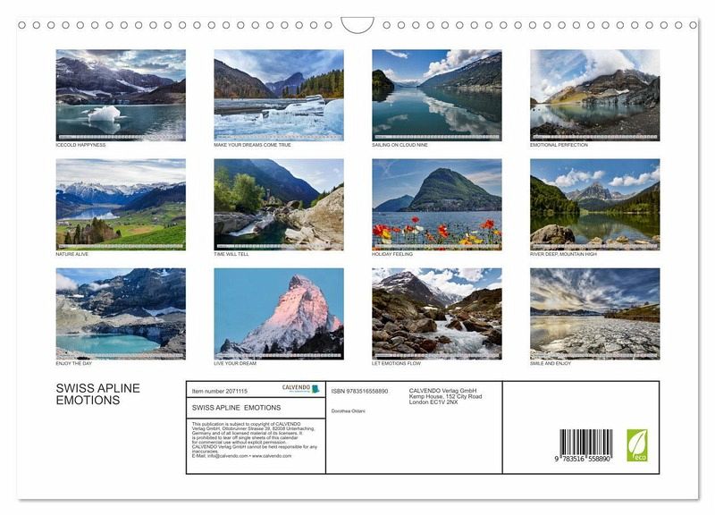 QUALITY - High-quality photo calendar with 12 beautiful images on light-resistant paper, robust spiral binding with hanger.SUSTAINABLE - Significant waste reduction due to print-on-demand production, environmentally friendly FSC-certified paper, produced in the UK, climate-conscious logistical processes.PERFECT GIFT - calendars for friends and family, for children, all ages and all occasions, from Christmas to birthdays and everything in between.LOTS OF CHOICE - Wall calendars in different sizes (DIN A4 and DIN A3), for any topic and personal taste, featuring photography, painting and illustrations.The mountains of Switzerland, a magic nature experience, author: Dorothea Oldani