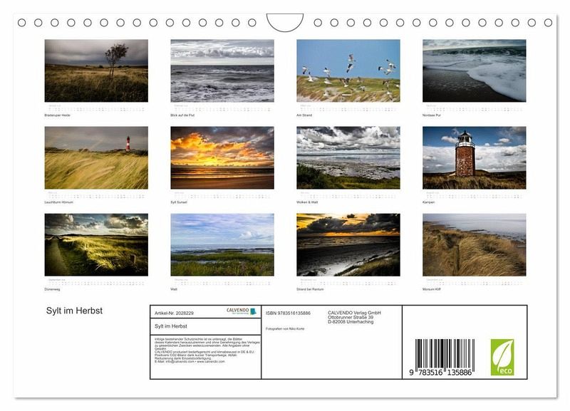 QUALITÄT - Hochwertiger Fotokalender mit 12 wunderschönen Motiven auf lichtbeständigem Bilderdruckpapier, robuste Spiralbindung mit Aufhängebügel.NACHHALTIG - deutliche Abfallreduzierung durch bedarfsgerechte Einzelstückfertigung, umweltfreundliches FSC-zertifiziertes Papier, Produktion in Deutschland, klimabewusste Logistik.PERFEKTES GESCHENK - Kalender für Freunde und Familie, für Kinder und Erwachsene, jung und alt, zu Weihnachten, Geburtstag oder zwischendurch.VIELFALT - Bildkalender in verschiedenen Formaten, z.B. DIN A5, DIN A4, DIN A3 sowie DIN A2. Ob Naturmotiv, Gemälde oder Fotos, ideal für ein persönliches Wohlfühlambiente.Landschaftsaufnahmen von Sylt im Herbst von Autor(in): Niko Korte