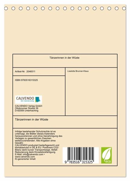 QUALITÄT - Hochwertiger Fotokalender mit 12 wunderschönen Motiven auf lichtbeständigem Bilderdruckpapier, robuste Spiralbindung.NACHHALTIG - deutliche Abfallreduzierung durch bedarfsgerechte Einzelstückfertigung, umweltfreundliches FSC-zertifiziertes Papier, Produktion in Deutschland, klimabewusste Logistik.PERFEKTES GESCHENK - Kalender für Freunde und Familie, für Kinder und Erwachsene, jung und alt, zu Weihnachten, Geburtstag oder zwischendurch.VIELFALT - Bildkalender in verschiedenen Formaten, z.B. DIN A5, DIN A4, DIN A3 sowie DIN A2. Ob Naturmotiv, Gemälde oder Fotos, ideal für ein persönliches Wohlfühlambiente.Tanzperformance auf dem heißen Wüstenboden von Autor(in): Liselotte Brunner-Klaus
