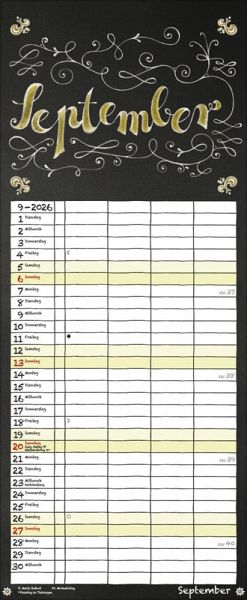 Übersichtlicher Familienplaner für bis zu 4 Personen; sehr stabile Rückwand; 19 x 46 cm Terminkalender mit viel Platz für Eintragungen, ohne störende Bilder in den Spalten leichte Beschreibbarkeit, auch mit Bunt- und Bleistiften Mehrsprachiges Kalendarium (d,e,f,i) mit regionalen Feiertagen für Deutschland, Österreich und Schweiz Farblich hervorgehobene Sonn- und Feiertage, sowie Anzeige der Zeitumstellung Gedruckt auf dickem und umweltfreundlichem FSC Papier