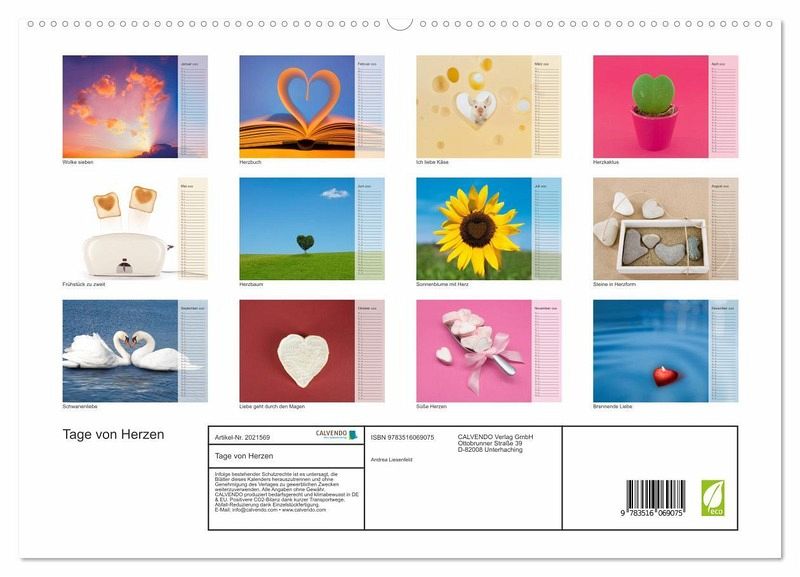 Der Wandkalender mit ansprechenden Herzmotiven bietet Platz für eigene Notizen wie Geburts- und Namenstage, sowie Anlässe die man nicht vergessen sollte. Er eignet sich ausserdem als Geschenk für einen geliebten Menschen.