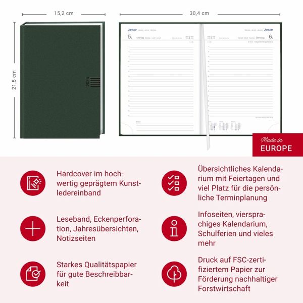 - Ein Klassiker für die persönliche oder berufliche Agenda: Neutraler Kalender mit wattiertem, grünen Einband- Für alle, die gern Struktur in ihren Alltag bringen: Kalenderbuch im A5-Format mit einer Seite Platz pro Tag, extra Notizseiten, Schulferien und Jahresvorschau 2026- Volle Konzentration auf das Wesentliche: Organisationshilfe im schlichten Design mit Eckperforation und Lesebändchen für Meetings im Büro oder im privaten Umfeld- Ein Allrounder für alle wichtigen Termine im Jahr: Der neue Cheftimer-Taschenkalender 2026 mit viersprachigem Kalendarium- Terminplanung auf die klassische Art: Buchkalender von Heye aus dem Athesia KalenderverlagSprachen: Deutsch, Englisch, Italienisch