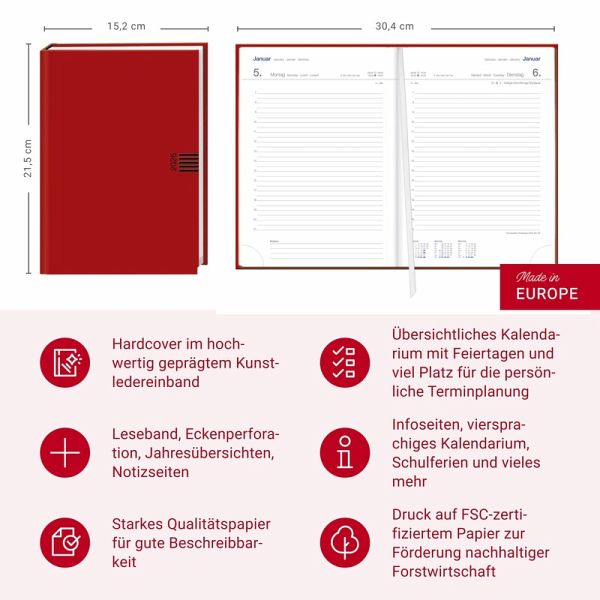 - Der treue Begleiter für 365 Tage voller Möglichkeiten: Der schlichte Chefplaner im Format A5 in Rot mit viersprachigem Kalendarium und Monatsübersichten- Neutraler Organizer, der's in sich hat: Terminplaner mit viel Platz für Notizen und sowie mit Adressbuch und To Do-Listen- Organisieren und den Überblick behalten: All das fällt leicht mit dem Buchkalender 2026 mit Tageskalendarium- Schulferien, Jahresübersicht, Reiseplanung: Der Terminkalender steckt voller Zusatz-Features, die Ihre Planung vereinfachen- Tag für Tag den Überblick behalten mit den Chefplanern von Heye aus dem Athesia KalenderverlagSprachen: Deutsch, Englisch, Italienisch