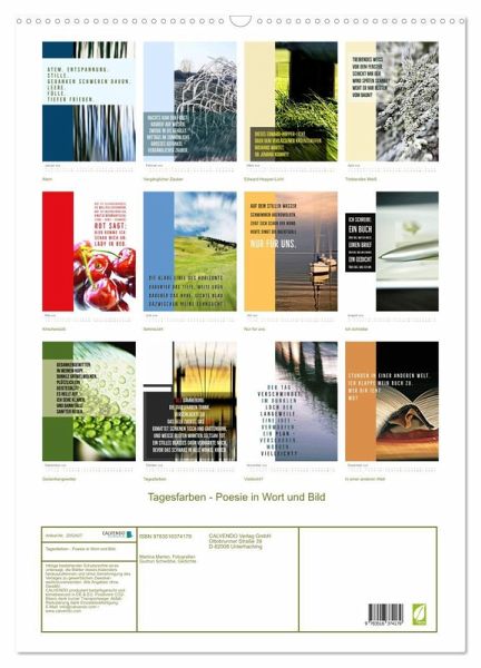 QUALITÄT - Hochwertiger Fotokalender mit 12 wunderschönen Motiven auf lichtbeständigem Bilderdruckpapier, robuste Spiralbindung mit Aufhängebügel.NACHHALTIG - deutliche Abfallreduzierung durch bedarfsgerechte Einzelstückfertigung, umweltfreundliches FSC-zertifiziertes Papier, Produktion in Deutschland, klimabewusste Logistik.PERFEKTES GESCHENK - Kalender für Freunde und Familie, für Kinder und Erwachsene, jung und alt, zu Weihnachten, Geburtstag oder zwischendurch.VIELFALT - Bildkalender in verschiedenen Formaten, z.B. DIN A5, DIN A4, DIN A3 sowie DIN A2. Ob Naturmotiv, Gemälde oder Fotos, ideal für ein persönliches Wohlfühlambiente.Kurze Gedichte mit ausgewählten Fotografien stellen eine treffliche, zum Nachdenken anregende Gesamtaussage dar. von Autor(in): Martina Marten