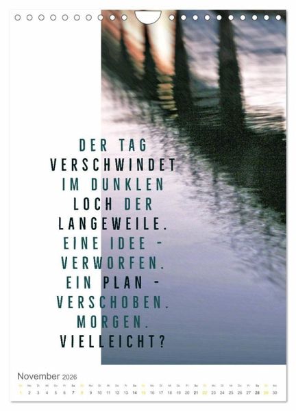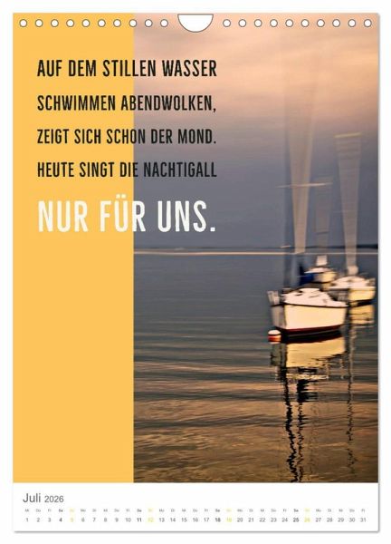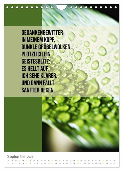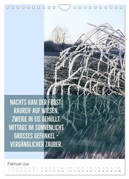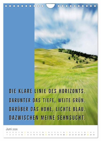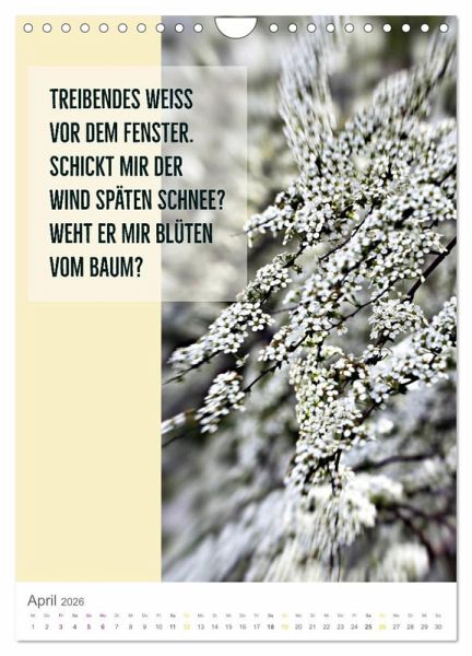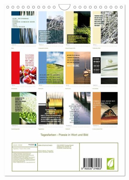 QUALITÄT - Hochwertiger Fotokalender mit 12 wunderschönen Motiven auf lichtbeständigem Bilderdruckpapier, robuste Spiralbindung mit Aufhängebügel.NACHHALTIG - deutliche Abfallreduzierung durch bedarfsgerechte Einzelstückfertigung, umweltfreundliches FSC-zertifiziertes Papier, Produktion in Deutschland, klimabewusste Logistik.PERFEKTES GESCHENK - Kalender für Freunde und Familie, für Kinder und Erwachsene, jung und alt, zu Weihnachten, Geburtstag oder zwischendurch.VIELFALT - Bildkalender in verschiedenen Formaten, z.B. DIN A5, DIN A4, DIN A3 sowie DIN A2. Ob Naturmotiv, Gemälde oder Fotos, ideal für ein persönliches Wohlfühlambiente.Kurze Gedichte mit ausgewählten Fotografien stellen eine treffliche, zum Nachdenken anregende Gesamtaussage dar. von Autor(in): Martina Marten