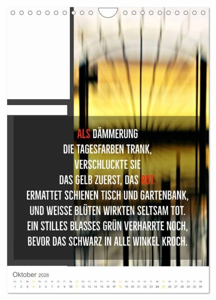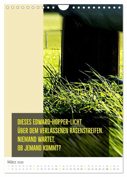 Knutschromantisch, Edward-Hopper-Licht, treibendes Weiß: Diese und viele andere treffende Wortkombinationen finden sich in den Gedichten zum Nachdenken und -spüren. Die passend dazu ausgewählten Fotografien unterstreichen die poetische und träumerische Aussage durch bewußt gewählte Bewegungsunschärfe. Monat für Monat ein kleines Bild-Text-Kunstwerk.