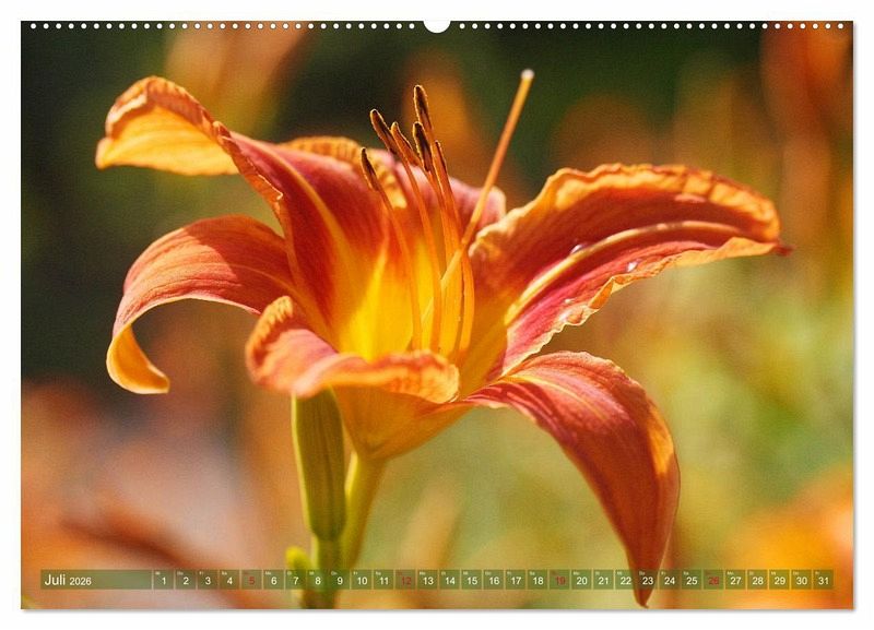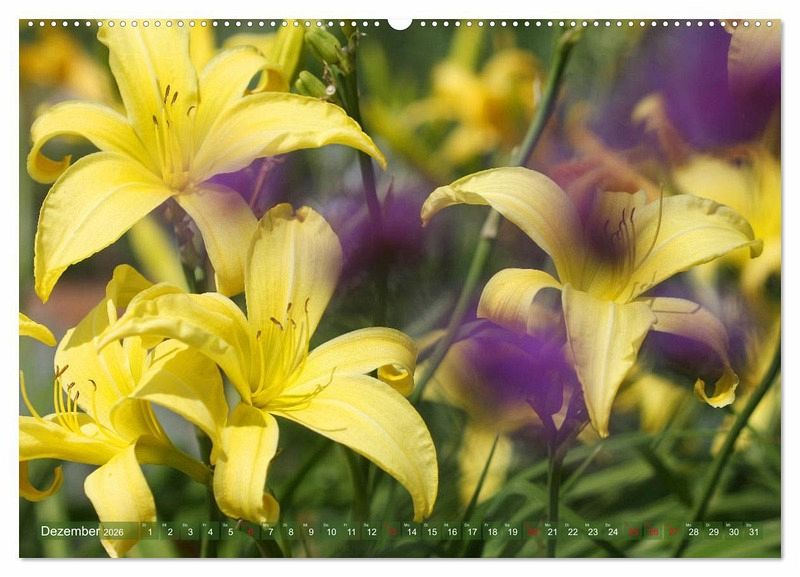 Die Taglilie öffnet jede Blüte nur für einen Tag - daher ihr Name. Die Staude bildet aber ab Mai so viele Knospen, dass ihre Blütezeit fast den ganzen Sommer anhält. Taglilien sind langlebig, pflegeleicht und anpassungsfähig. Sie lieben die Sonne, können aber auch im Halbschatten gedeihen - dann bilden sie jedoch weniger Knospen. Der Kalender präsentiert Ihnen viele Facetten der beliebten Gartenstaude in abwechslungsreichen, interessanten Fotografien.