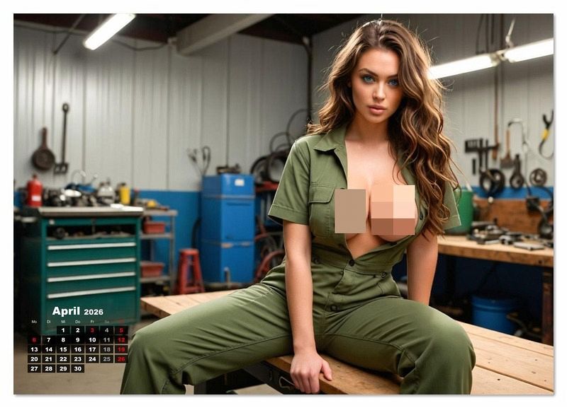 Entdecke pure Erotik im Werkstattkalender mit sexy Frauen, die die Werkbank und Ihre Brüste zur Bühne machen. Ob mit offenen Overalls, freiem Blick auf die Brüste, bzw. Busen oder lasziv zwischen Werkzeug und Motoröl - dieser Frauenkalender bringt heiße Stimmung in jede Werkstatt. Jeden Monat erwarten dich neue, aufregende sexy Frauen-Bilder starker und heißer Frauen in erotischen Werkstatt-Szenen. Ein echter Hingucker für alle, die sexy Frauen lieben und dabei auf Stil, Kurven und knisternde Erotik setzen. Ob als Kalender für Männer, Geschenk für den Kumpel, oder für die eigene Wand - dieser mit KI-generierte Werkstattkalender für Männer vereint Brüste, Werkstatt-Flair und erotische Fotokunst zu einem Kalender, der garantiert Aufmerksamkeit erregt.