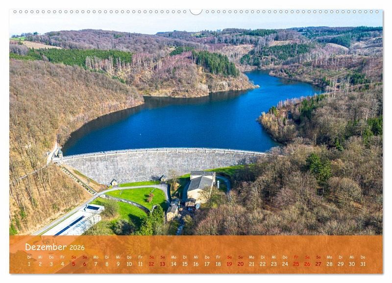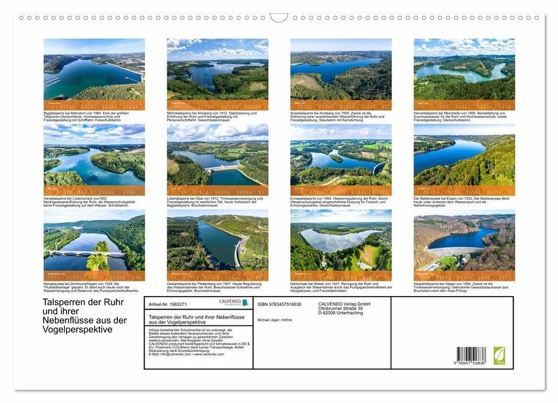 Talsperren dienen der Trinkwasserversorgung, dem Hochwasserschutz und manchen auch dem Freizeitvergnügen. In diesem Kalender sind die größten Talsperren der Ruhr und ihrer Nebenflüsse im Bergischen- und Sauerland aus der Vogelperspektive dargestellt. Das Deckblatt zeigt die Staumauer der Listertalsperre, die inzwischen als Vorbecken der Biggetalsperre fungiert.
