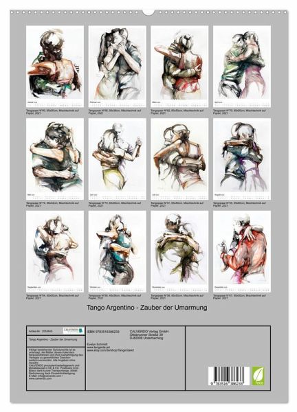 Tango Argentino ist ... getanzte Leidenschaft, ein nonverbaler Dialog, Hingabe, und noch vieles mehr. Was diesem außergewöhnlichen Tanz einen ganz besonderen Zauber verleiht ist die innige Umarmung. Diese magische Verbindung ausdrucksstark darzustellen, war für mich das Ziel bei der Erschaffung der Zeichnungen und Gemälde in diesem Kalender.
