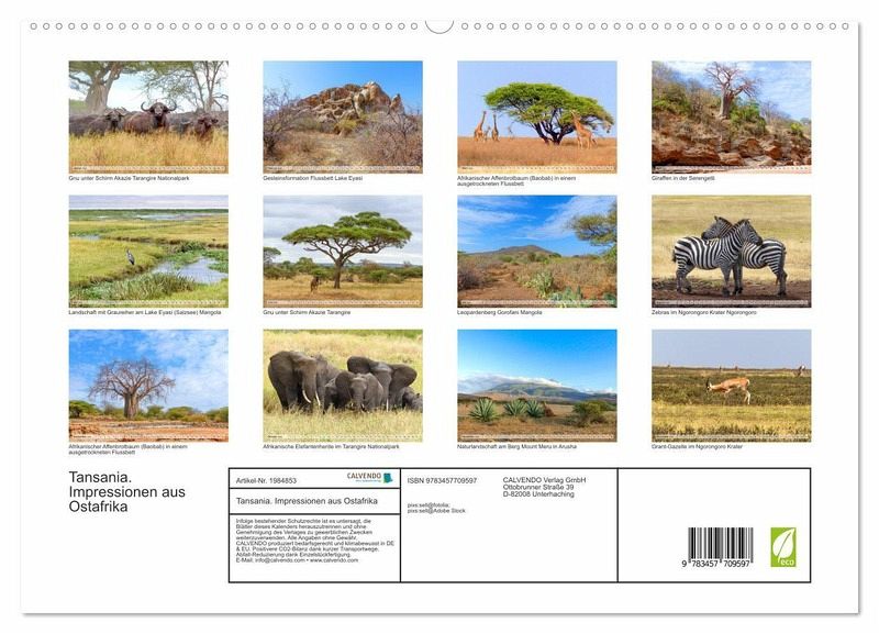 Dieser Kalender nimmt Sie mit zu den schönsten und wildesten Nationalparks und Schutzgebieten Ostafrikas, wie der Serengeti, dem Ngorongoro-Krater, Lake Eyasi und dem Mount Meru. Zudem gibt es jede Menge Impressionen aus der beeindruckenden Flora und Fauna Tansanias.