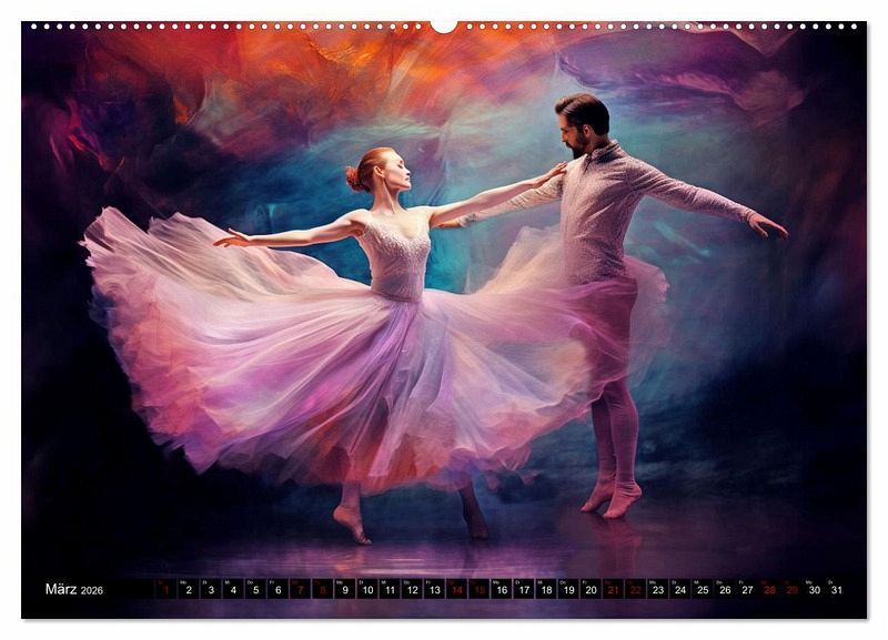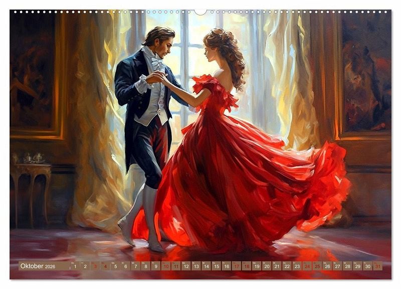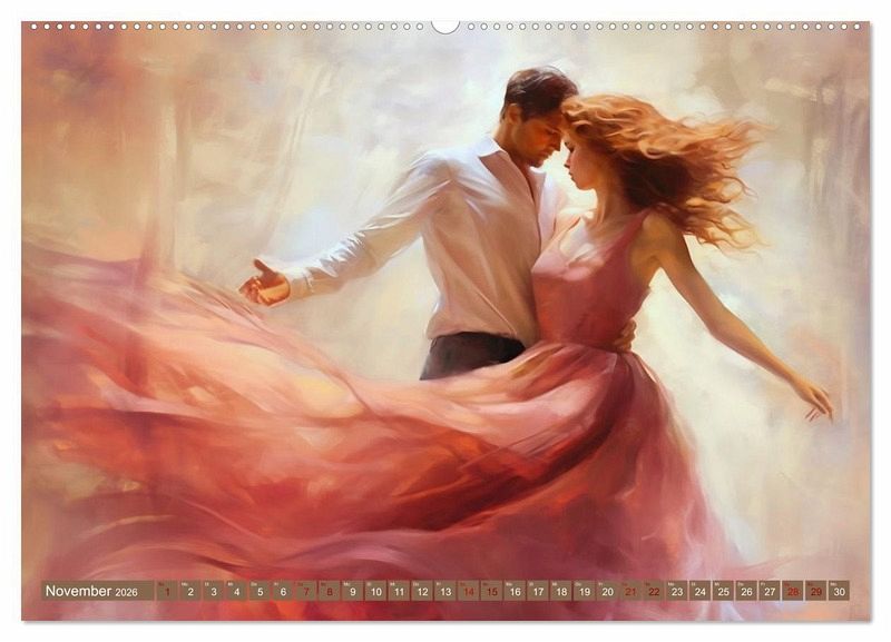 Dieser Kalender ist eine sinnliche Reise durch die Welt des Tanzes und des Flirts. Jeder Monat präsentiert eine Illustration von anmutigen tanzenden Paaren, die die Leidenschaft und das Knistern zwischen ihnen zum Ausdruck bringen.