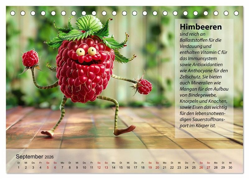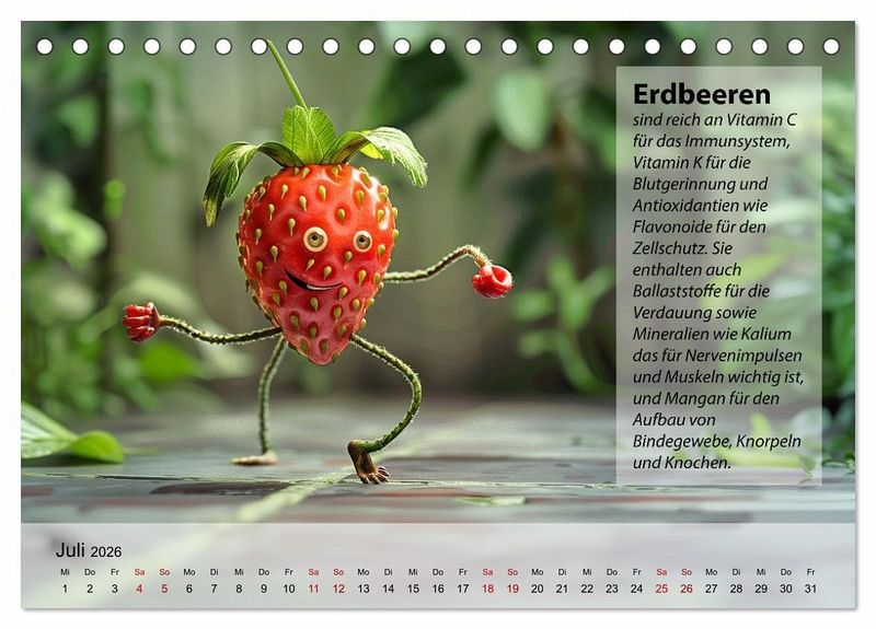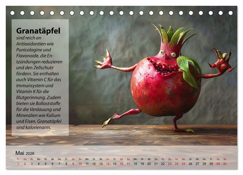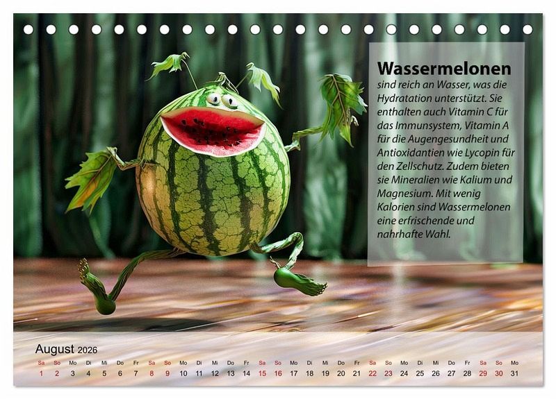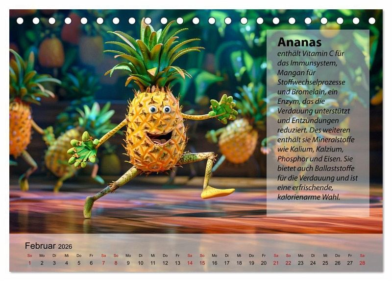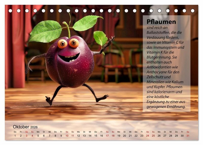 Tauchen Sie ein in die fruchtige Welt unseres Tanzenden Früchtekalenders! Erleben Sie gesunde Vitalität mit jedem Monat, wenn lebhafte Früchte auf der Bühne tanzen. Entdecken Sie die Farbenpracht und Vielfalt der Natur, Monat für Monat. Ein Genuss für die Sinne und eine Quelle der Inspiration für das ganze Jahr! Ein bunter Kalender erstellt mit KI. Früchte mal anders.