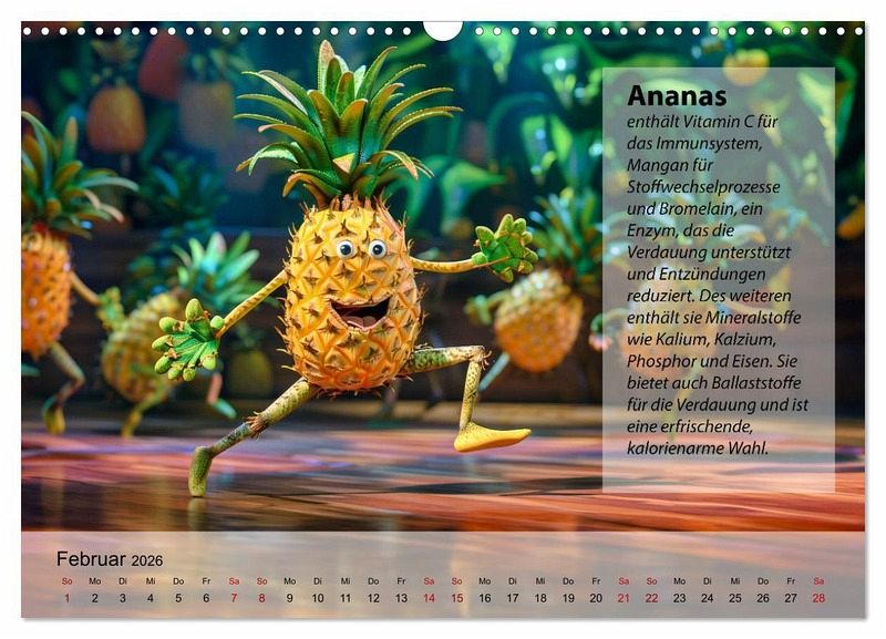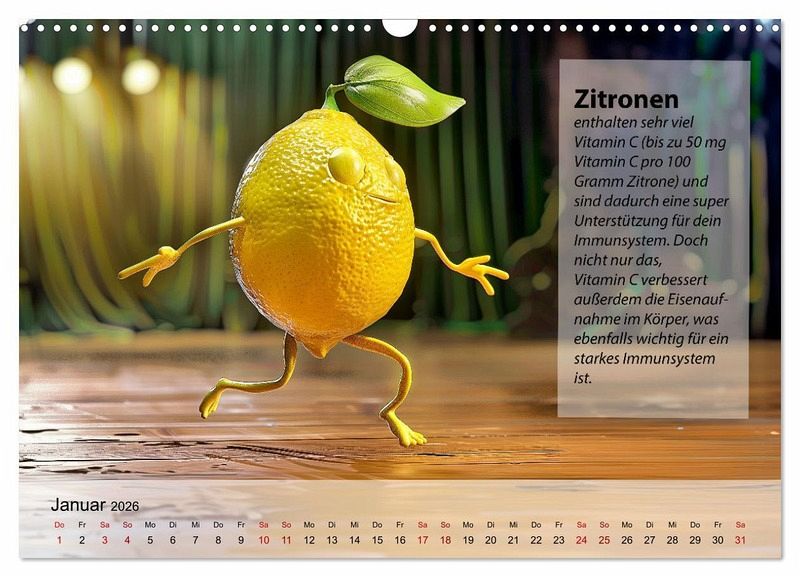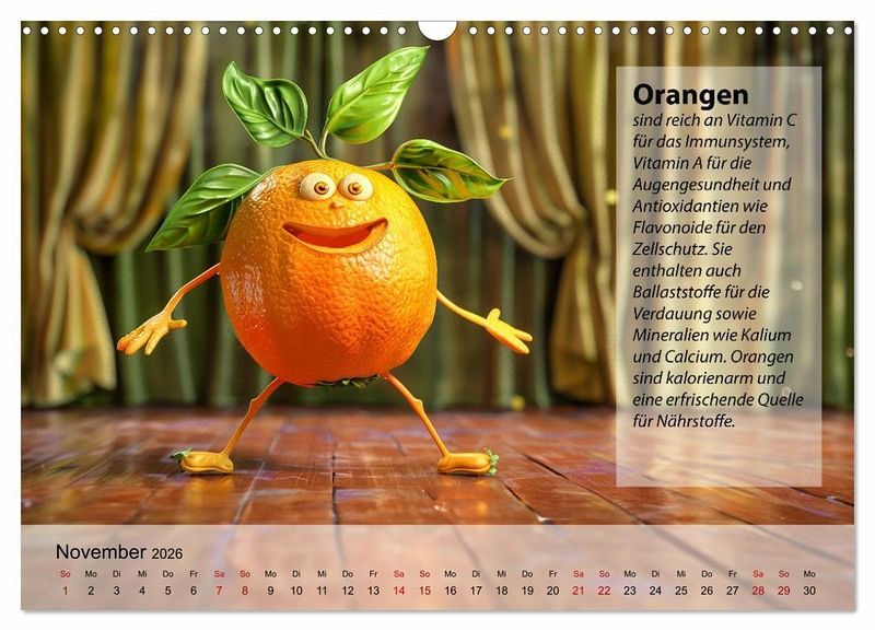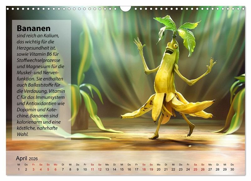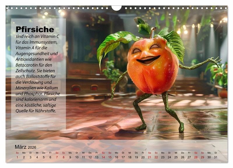 Tauchen Sie ein in die fruchtige Welt unseres Tanzenden Früchtekalenders! Erleben Sie gesunde Vitalität mit jedem Monat, wenn lebhafte Früchte auf der Bühne tanzen. Entdecken Sie die Farbenpracht und Vielfalt der Natur, Monat für Monat. Ein Genuss für die Sinne und eine Quelle der Inspiration für das ganze Jahr! Ein bunter Kalender erstellt mit KI. Früchte mal anders.