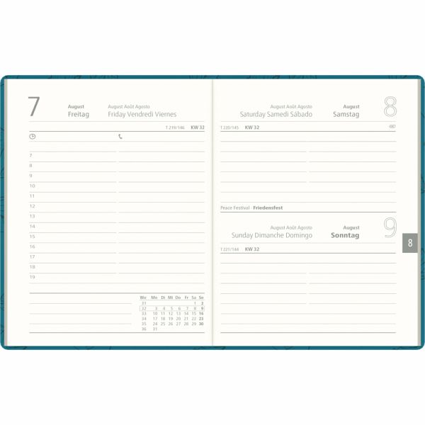 Kalendertyp: Taschenkalender Typ 610Übersichtliches Kalendarium: 1 Tag pro Seite (Samstag und Sonntag zusammengefasst), mit Monatsübersicht, Tages- und WochenzählungPraktische Details: Stundeneinteilung von 7 19 Uhr, Eckperforation zum schnellen Finden des aktuellen Tages und Lesezeichen für bequemes ArbeitenZusatzinformationen: Mit Ferienterminen, Postentgelten, Ernährungstipps und weiteren nützlichen InfosNützliche Extras: Telefon- und Adressverzeichnis sowie viel Platz für persönliche NotizenNachhaltig produziert: Aus Recyclingpapier hergestellt, Blauer Engel zertifiziert, gefertigt in DeutschlandSprachvielfalt: 4-sprachiges Kalendarium (DE/GB/FR/ES)Format & Ausstattung: 10 × 14 cm, 400 Seiten, robuster türkisfarbener Kartoneinband für eine edle Optik