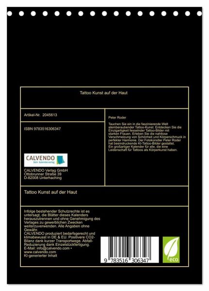 QUALITÄT - Hochwertiger Fotokalender mit 12 wunderschönen Motiven auf lichtbeständigem Bilderdruckpapier, robuste Spiralbindung.NACHHALTIG - deutliche Abfallreduzierung durch bedarfsgerechte Einzelstückfertigung, umweltfreundliches FSC-zertifiziertes Papier, Produktion in Deutschland, klimabewusste Logistik.PERFEKTES GESCHENK - Kalender für Freunde und Familie, für Kinder und Erwachsene, jung und alt, zu Weihnachten, Geburtstag oder zwischendurch.VIELFALT - Bildkalender in verschiedenen Formaten, z.B. DIN A5, DIN A4, DIN A3 sowie DIN A2. Ob Naturmotiv, Gemälde oder Fotos, ideal für ein persönliches Wohlfühlambiente.Tattoo Kunst auf der Haut - Lebenseinstellung vereint mit individuellem und einzigartigem Körperschmuck. von Autor(in): Peter Roder