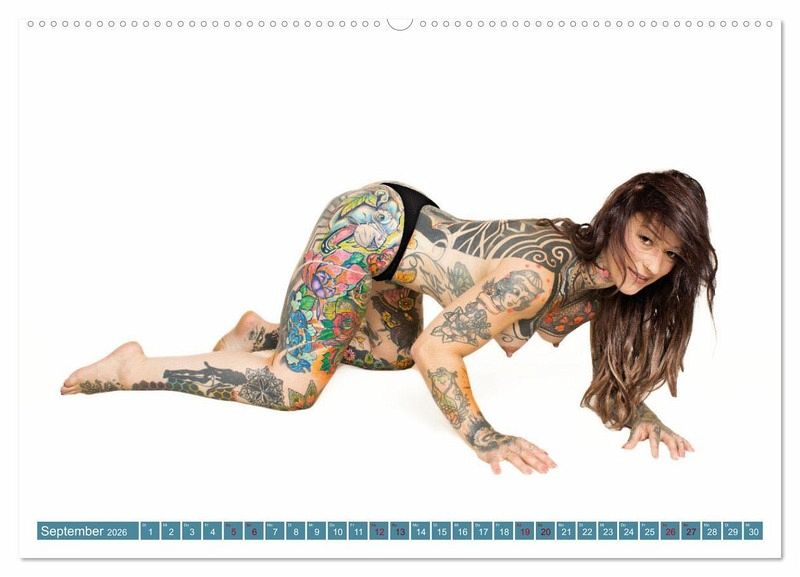 Das Model in unserem Kalender präsentiert ihre Tattoos in sinnlichen und kraftvollen Posen, die die Schönheit ihrer Kunstwerke
