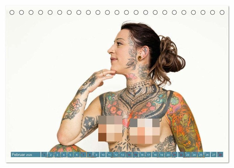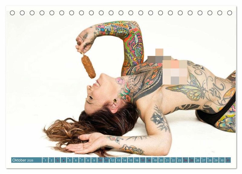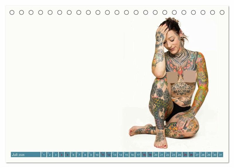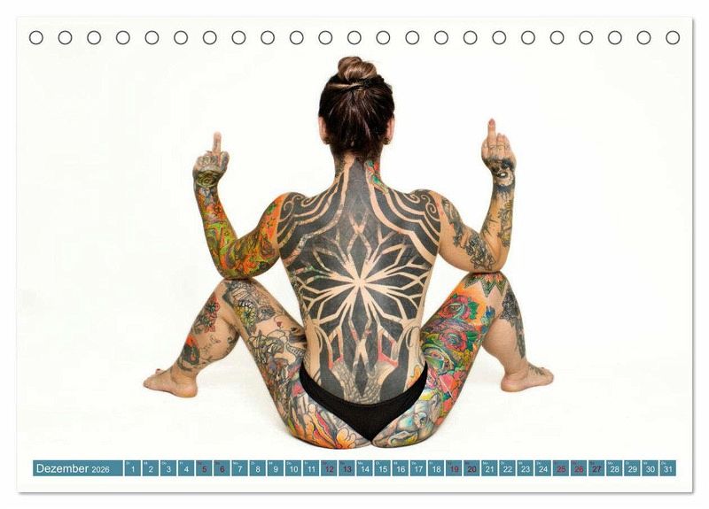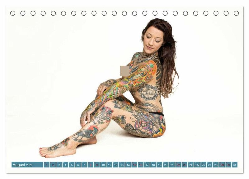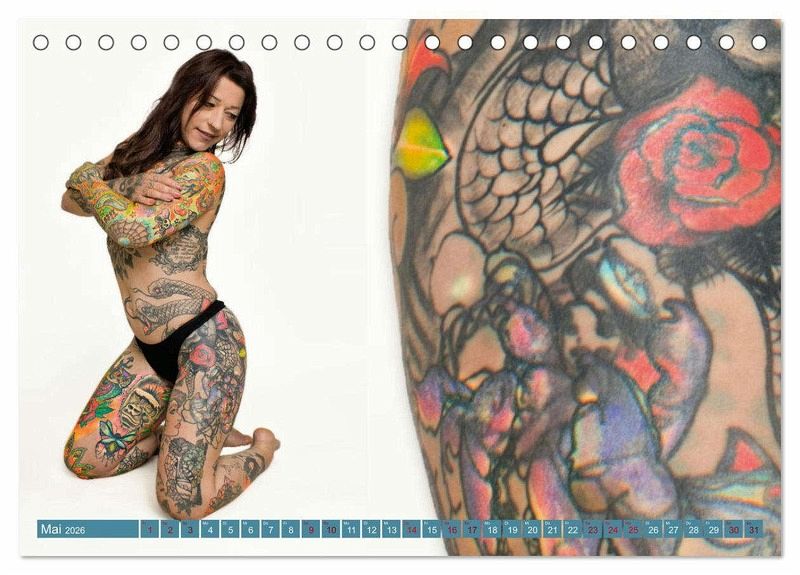 Das Model in unserem Kalender präsentiert ihre Tattoos in sinnlichen und kraftvollen Posen, die die Schönheit ihrer Kunstwerke
