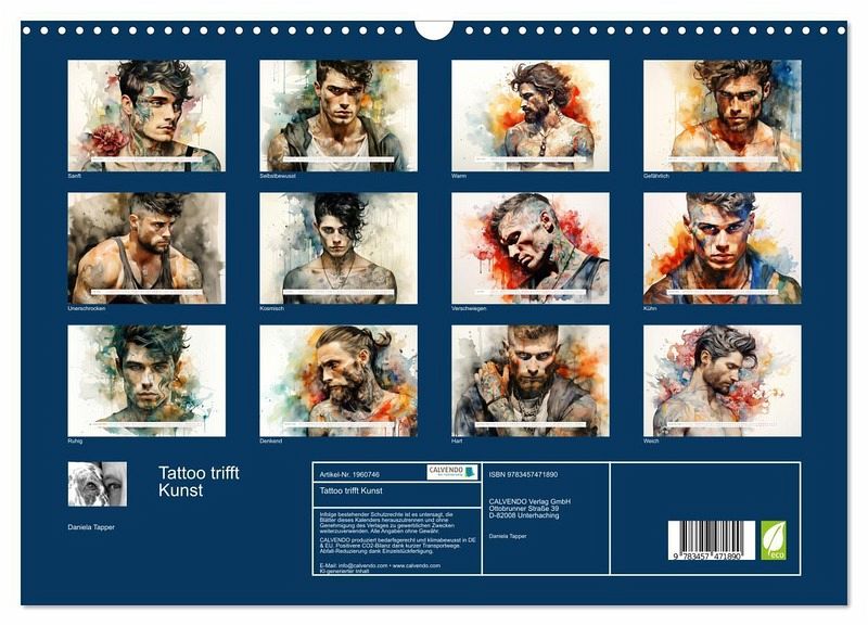 QUALITÄT - Hochwertiger Fotokalender mit 12 wunderschönen Motiven auf lichtbeständigem Bilderdruckpapier, robuste Spiralbindung mit Aufhängebügel.NACHHALTIG - deutliche Abfallreduzierung durch bedarfsgerechte Einzelstückfertigung, umweltfreundliches FSC-zertifiziertes Papier, Produktion in Deutschland, klimabewusste Logistik.PERFEKTES GESCHENK - Kalender für Freunde und Familie, für Kinder und Erwachsene, jung und alt, zu Weihnachten, Geburtstag oder zwischendurch.VIELFALT - Bildkalender in verschiedenen Formaten, z.B. DIN A5, DIN A4, DIN A3 sowie DIN A2. Ob Naturmotiv, Gemälde oder Fotos, ideal für ein persönliches Wohlfühlambiente.Starke Tattoos treffen sanftes Aquarell von Autor(in): Daniela Tapper