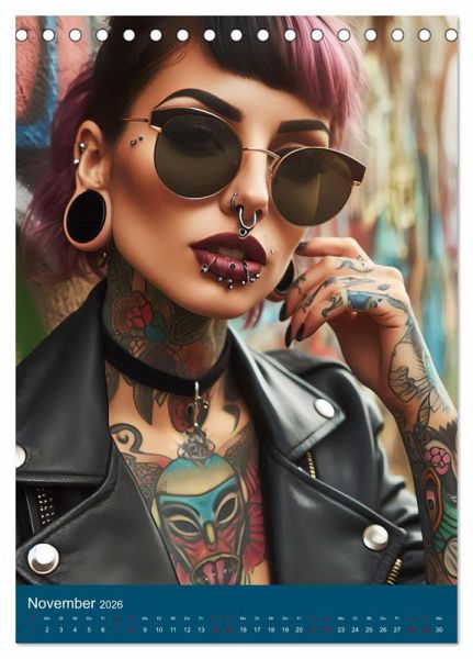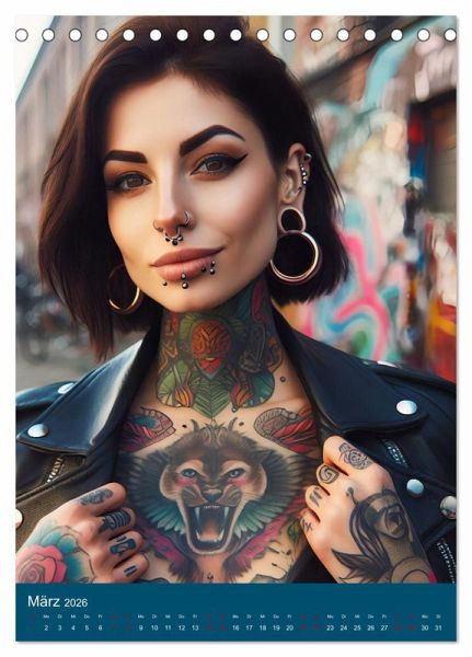 Entdecken Sie unseren exklusiven Kalender, der die Schönheit und Vielfalt von Frauen mit Tattoos und Piercings zelebriert. Lassen Sie sich Monat für Monat von atemberaubenden Porträts inspirieren, die Stärke, Individualität und kreative Selbstverwirklichung in Szene setzen. Dieser Kalender ist mehr als nur ein Begleiter durch das Jahr - er ist eine Hommage an jene, die ihren Körper zu einer Leinwand gemacht haben und stolz ihre Persönlichkeit präsentieren.