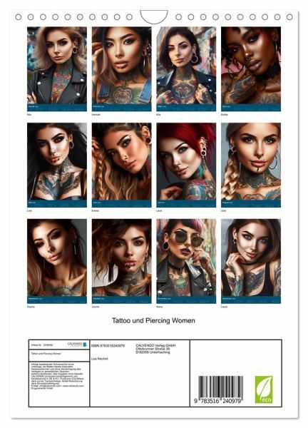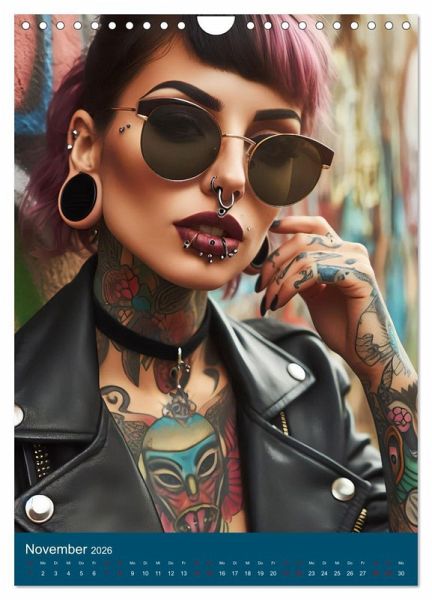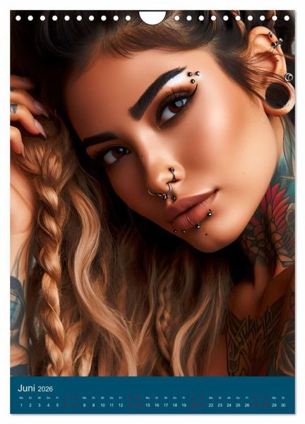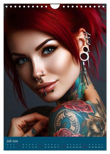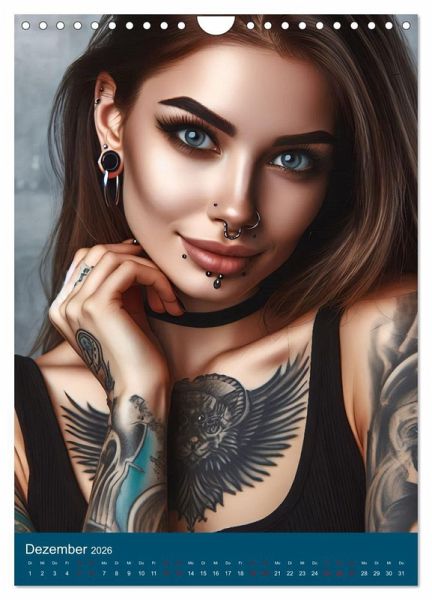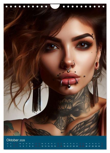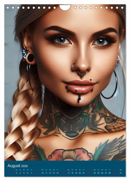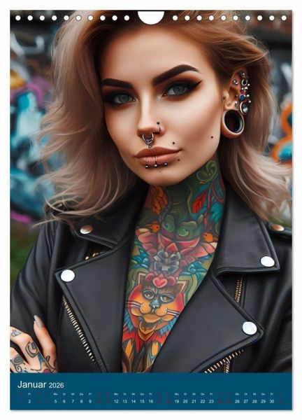 Entdecken Sie unseren exklusiven Kalender, der die Schönheit und Vielfalt von Frauen mit Tattoos und Piercings zelebriert. Lassen Sie sich Monat für Monat von atemberaubenden Porträts inspirieren, die Stärke, Individualität und kreative Selbstverwirklichung in Szene setzen. Dieser Kalender ist mehr als nur ein Begleiter durch das Jahr - er ist eine Hommage an jene, die ihren Körper zu einer Leinwand gemacht haben und stolz ihre Persönlichkeit präsentieren.