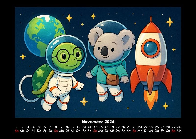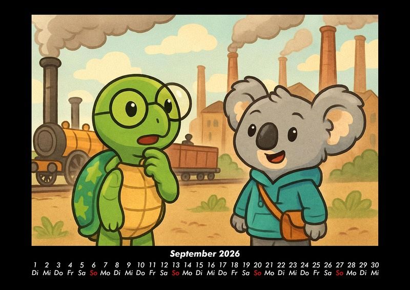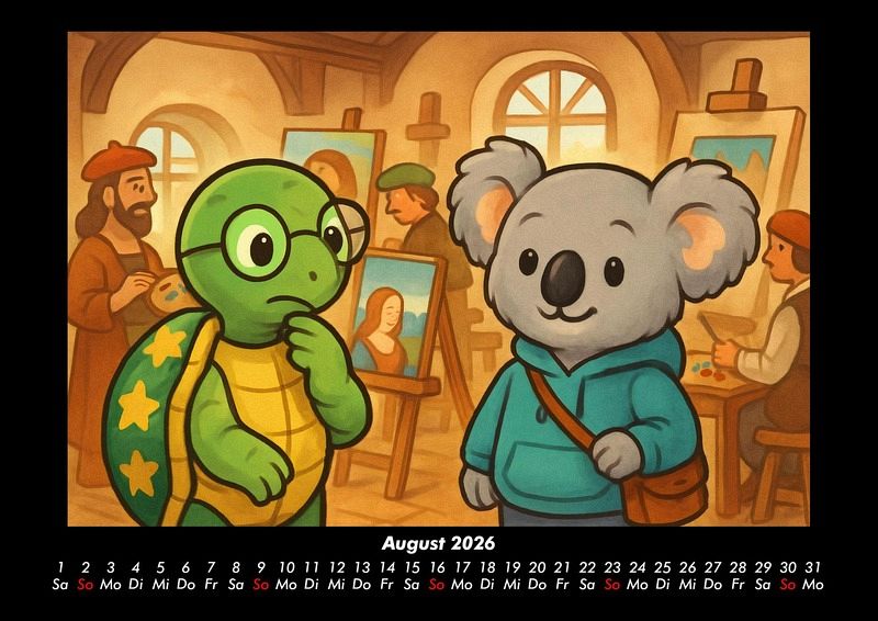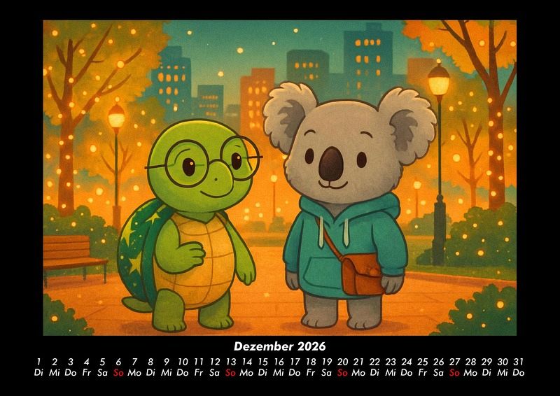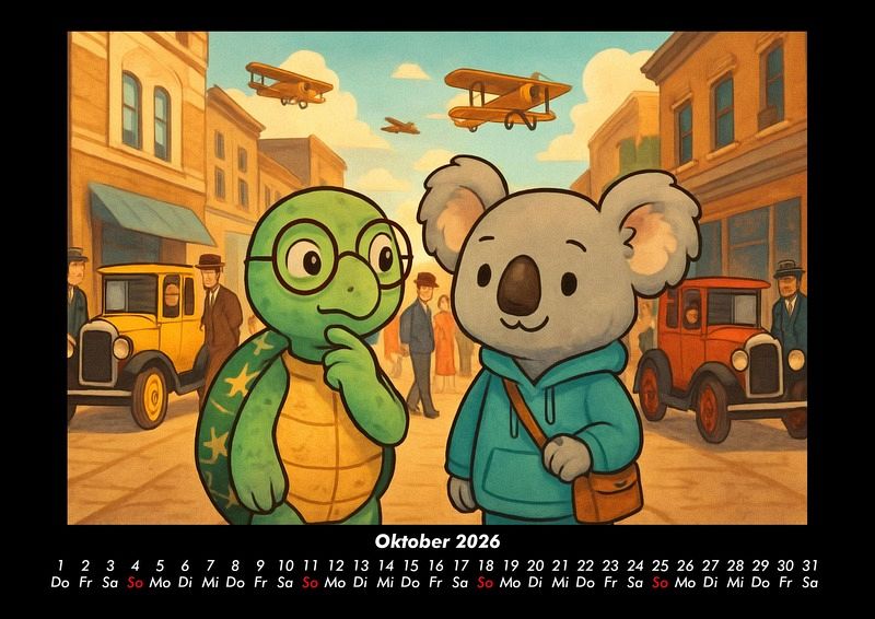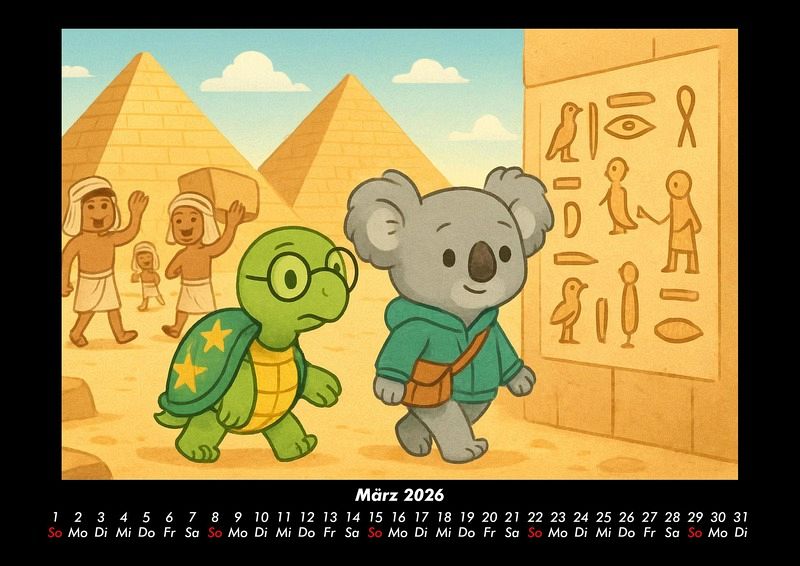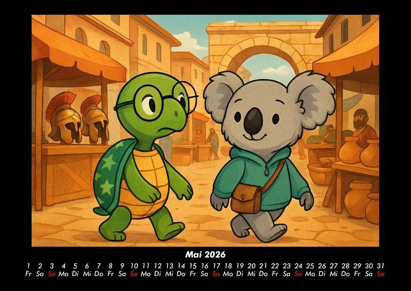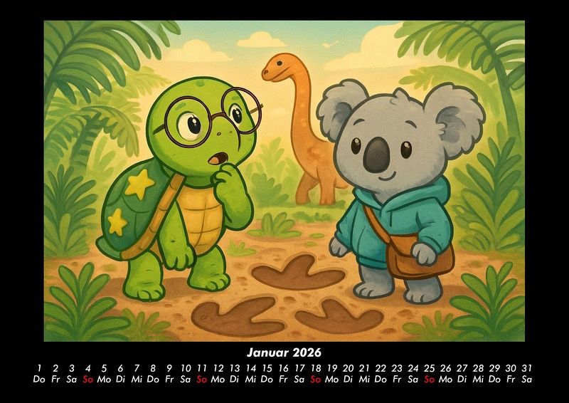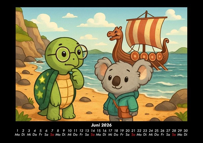 Taz & Kiki - Eine Reise durch die Zeit 2026 Motivkalender DIN A3 Begleite Taz die Schildkröte und Kiki den Koala auf einer farbenfrohen Reise durch die Zeit - von den majestätischen Dinosauriern über die frühen Menschen, das alte Ägypten, die Wikinger und das Mittelalter bis hin zur Neuzeit und in die Moderne. In jedem Monat erleben die beiden Freunde ein neues spannendes Zeitalter, entdecken Geheimnisse vergangener Welten und wachsen an ihren Abenteuern. Dieser liebevoll gestaltete Kalender erzählt eine kleine Zeitreise-Geschichte voller Wärme, Humor und Neugier. Perfekt für Kinder, Familien und alle, die fantasievolle Illustrationen lieben. Vero-Kalender Kids zeigen liebevoll gestaltete Monatskalender mit bunten Bild-Motiven tierischer Freunde, die gemeinsam spannende Abenteuer erleben und die Welt entdecken. Ob in fernen Ländern, zwischen berühmten Sehenswürdigkeiten oder in magischen Landschaften - die fröhlichen Tiercharaktere begleiten Kinder Monat für Monat durch ein Jahr voller Fantasie, Freude und Freundschaft. Gedruckt werden die Kinder-Kalender aus dem Vero Verlag auf hochwertigem Kalenderbogen in Premium-Qualität und in verschiedenen Größen.