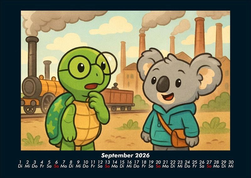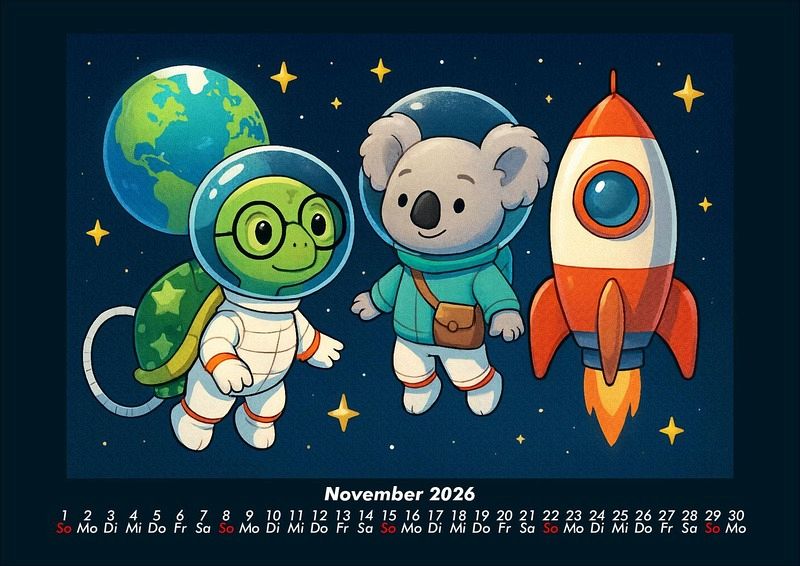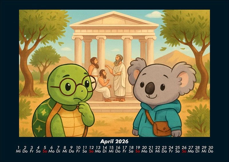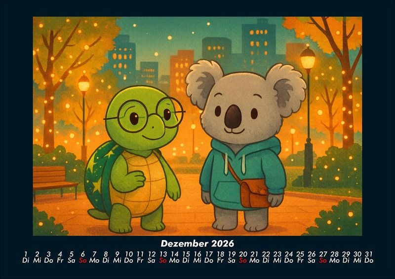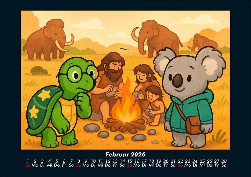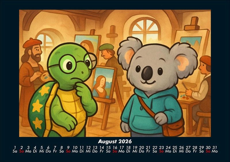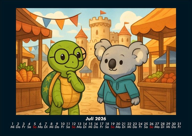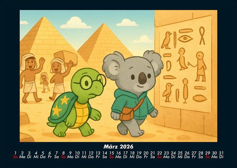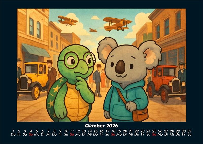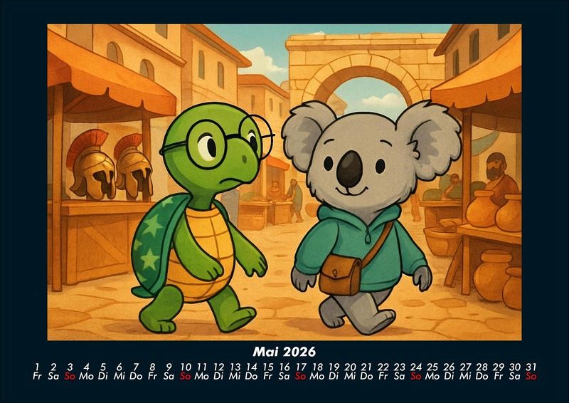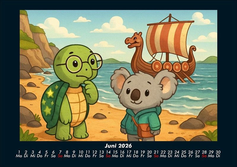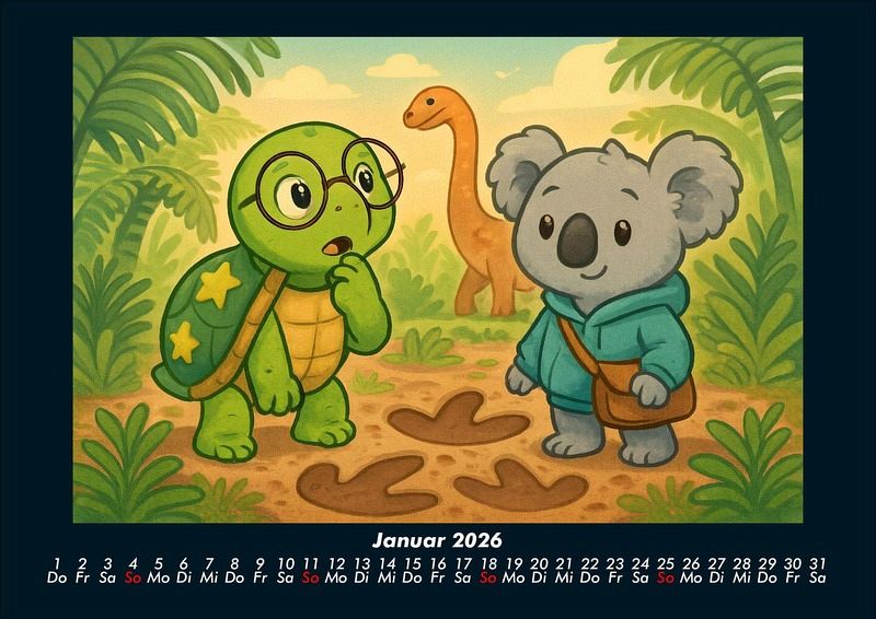 Taz & Kiki - Eine Reise durch die Zeit 2026 Motivkalender DIN A4 Begleite Taz die Schildkröte und Kiki den Koala auf einer farbenfrohen Reise durch die Zeit - von den majestätischen Dinosauriern über die frühen Menschen, das alte Ägypten, die Wikinger und das Mittelalter bis hin zur Neuzeit und in die Moderne. In jedem Monat erleben die beiden Freunde ein neues spannendes Zeitalter, entdecken Geheimnisse vergangener Welten und wachsen an ihren Abenteuern. Dieser liebevoll gestaltete Kalender erzählt eine kleine Zeitreise-Geschichte voller Wärme, Humor und Neugier. Perfekt für Kinder, Familien und alle, die fantasievolle Illustrationen lieben. Vero-Kalender Kids zeigen liebevoll gestaltete Monatskalender mit bunten Bild-Motiven tierischer Freunde, die gemeinsam spannende Abenteuer erleben und die Welt entdecken. Ob in fernen Ländern, zwischen berühmten Sehenswürdigkeiten oder in magischen Landschaften - die fröhlichen Tiercharaktere begleiten Kinder Monat für Monat durch ein Jahr voller Fantasie, Freude und Freundschaft. Gedruckt werden die Kinder-Kalender aus dem Vero Verlag auf hochwertigem Kalenderbogen in Premium-Qualität und in verschiedenen Größen.