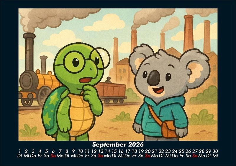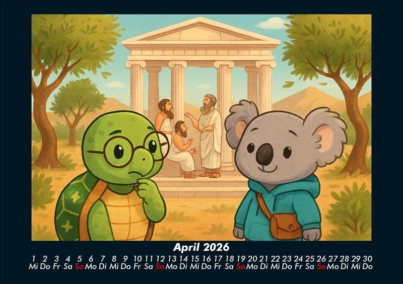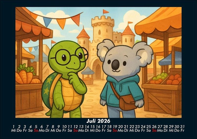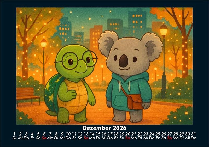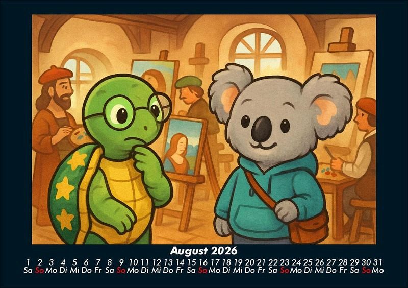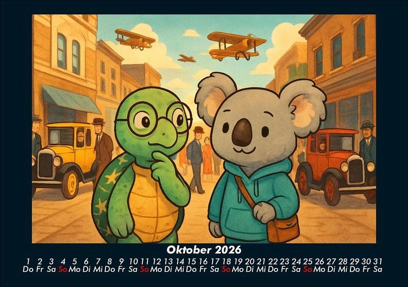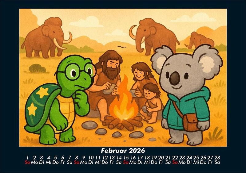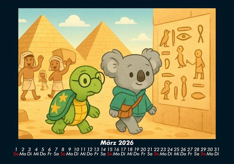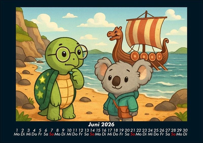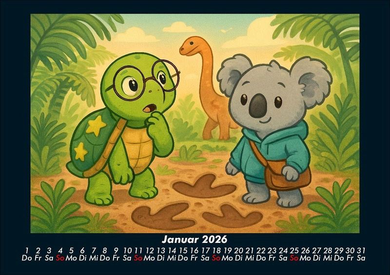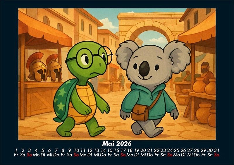 Taz & Kiki - Eine Reise durch die Zeit 2026 Motivkalender DIN A5 Begleite Taz die Schildkröte und Kiki den Koala auf einer farbenfrohen Reise durch die Zeit - von den majestätischen Dinosauriern über die frühen Menschen, das alte Ägypten, die Wikinger und das Mittelalter bis hin zur Neuzeit und in die Moderne. In jedem Monat erleben die beiden Freunde ein neues spannendes Zeitalter, entdecken Geheimnisse vergangener Welten und wachsen an ihren Abenteuern. Dieser liebevoll gestaltete Kalender erzählt eine kleine Zeitreise-Geschichte voller Wärme, Humor und Neugier. Perfekt für Kinder, Familien und alle, die fantasievolle Illustrationen lieben. Vero-Kalender Kids zeigen liebevoll gestaltete Monatskalender mit bunten Bild-Motiven tierischer Freunde, die gemeinsam spannende Abenteuer erleben und die Welt entdecken. Ob in fernen Ländern, zwischen berühmten Sehenswürdigkeiten oder in magischen Landschaften - die fröhlichen Tiercharaktere begleiten Kinder Monat für Monat durch ein Jahr voller Fantasie, Freude und Freundschaft. Gedruckt werden die Kinder-Kalender aus dem Vero Verlag auf hochwertigem Kalenderbogen in Premium-Qualität und in verschiedenen Größen.