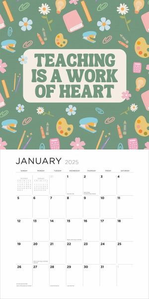 New! A year-long education celebration for teachers of any grade and subject. * MOTIVATION AND INSPIRATION: Each month features a phrase, quote, or reminder to keep educators inspired throughout the month: Strive for progress, not for perfection. You are making a difference every day. * FUN AND FUNCTIONAL: Illustrated with charming hand-lettering by elementary school teacher and designer Christine Lee. Plus colorful stickers for tracking days off, class trips, conferences, and more! * PERFECT TEACHER GIFT: Let the teacher in your life know that they’re appreciated and their work matters – a perfect gift from a student or a friend. * NOW PLASTIC-FREE!: For 2025, Workman Calendars are completely plastic-free. All wall calendars are now printed with an extended paper flap closed with a fully recyclable seal – no more shrink wrap!