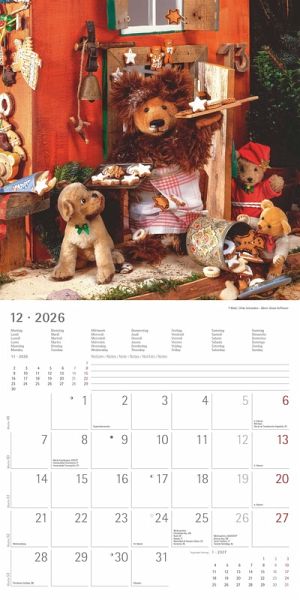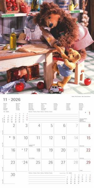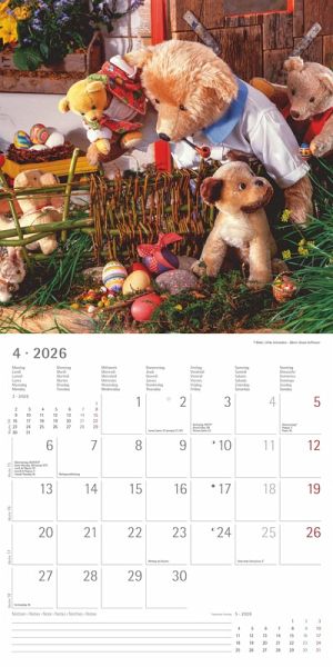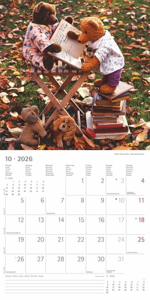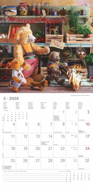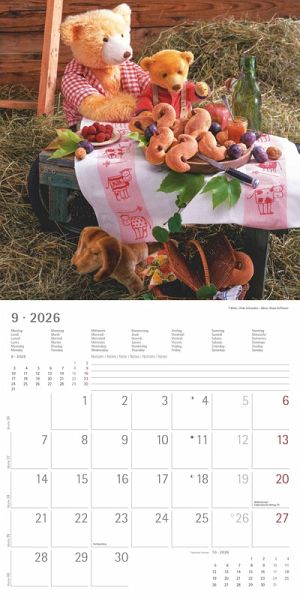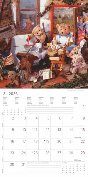 Das übersichtliche Kalendarium, welches Monat für Monat zahlreiche Zusatzinformationen liefert (z. B. Monatsübersichten, Ferientermine oder Mondphasen) und auch viel Platz für Notizen bietet, fügt sich harmonisch unter den Fotomotiven an. Der Bildkalender Teddy 2026 der Marke Alpha Edition begleitet Sie mit wunderbaren Bärchen-Szenerien durch das Jahr und ist auch stets eine schöne Geschenkidee.
