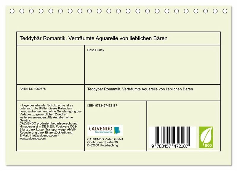 QUALITÄT - Hochwertiger Fotokalender mit 12 wunderschönen Motiven auf lichtbeständigem Bilderdruckpapier, robuste Spiralbindung.NACHHALTIG - deutliche Abfallreduzierung durch bedarfsgerechte Einzelstückfertigung, umweltfreundliches FSC-zertifiziertes Papier, Produktion in Deutschland, klimabewusste Logistik.PERFEKTES GESCHENK - Kalender für Freunde und Familie, für Kinder und Erwachsene, jung und alt, zu Weihnachten, Geburtstag oder zwischendurch.VIELFALT - Bildkalender in verschiedenen Formaten, z.B. DIN A5, DIN A4, DIN A3 sowie DIN A2. Ob Naturmotiv, Gemälde oderFotos, ideal für ein persönliches Wohlfühlambiente.Duftige Illustrationen von zauberhaften Teddys von Autor(in): Rose Hurley