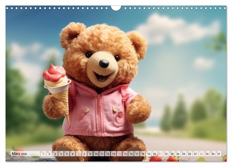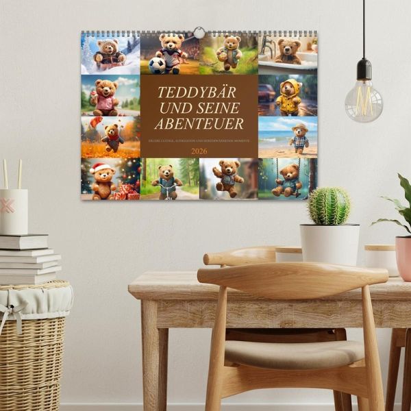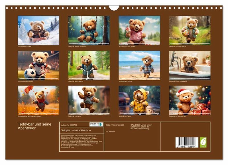 Entdecke die zauberhafte Welt des Teddybären mit unserem bezaubernden Wandkalender "Teddybär und seine Abenteuer"! Lass dich verzaubern und begleite unseren liebenswerten Teddybären auf seiner aufregenden Reise durch die Jahreszeiten. Der Wandkalender "Teddybär und seine Abenteuer" eignet sich nicht nur perfekt, um dein Zuhause mit einer warmen und verspielten Atmosphäre zu erfüllen, sondern ist auch das ideale Geschenk und Mitbringsel für Freunde, Familie und Kollegen. Zeige deine Wertschätzung und zaubere ein Lächeln in die Gesichter deiner Liebsten, indem du ihnen diesen herzerwärmenden Kalender schenkst. Hochwertiges Papier und eine erstklassige Druckqualität sorgen dafür, dass die lebendigen Farben und die liebevolle Gestaltung des Kalenders auch nach Monaten noch genauso strahlen wie am ersten Tag. Erstellt wurde dieser Kalender im Übrigen mit KI und Photoshop.