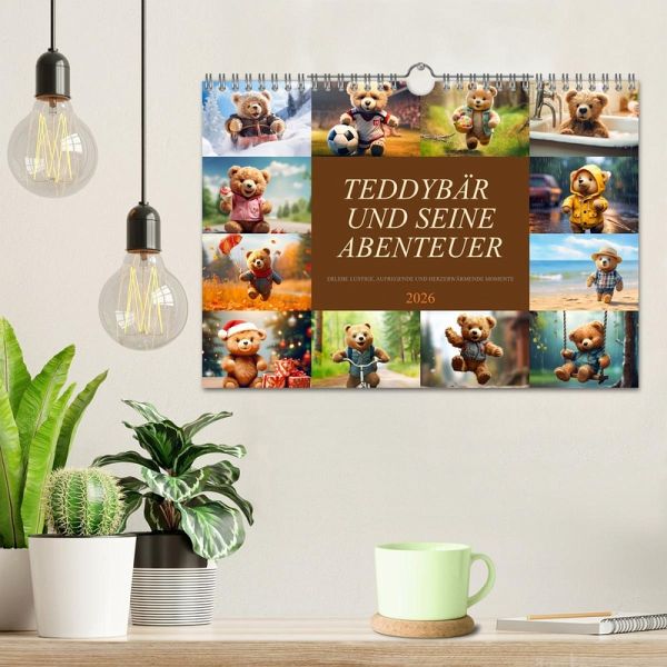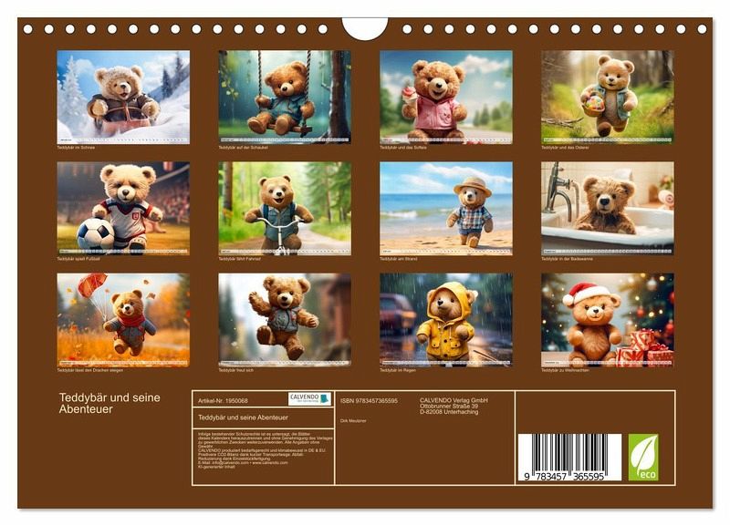Entdecke die zauberhafte Welt des Teddybären mit unserem bezaubernden Wandkalender "Teddybär und seine Abenteuer"! Lass dich verzaubern und begleite unseren liebenswerten Teddybären auf seiner aufregenden Reise durch die Jahreszeiten. Der Wandkalender "Teddybär und seine Abenteuer" eignet sich nicht nur perfekt, um dein Zuhause mit einer warmen und verspielten Atmosphäre zu erfüllen, sondern ist auch das ideale Geschenk und Mitbringsel für Freunde, Familie und Kollegen. Zeige deine Wertschätzung und zaubere ein Lächeln in die Gesichter deiner Liebsten, indem du ihnen diesen herzerwärmenden Kalender schenkst. Hochwertiges Papier und eine erstklassige Druckqualität sorgen dafür, dass die lebendigen Farben und die liebevolle Gestaltung des Kalenders auch nach Monaten noch genauso strahlen wie am ersten Tag. Erstellt wurde dieser Kalender im Übrigen mit KI und Photoshop.
