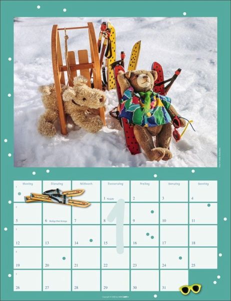 - Da werden Kindheitserinnerungen wach: In diesem zauberhaften Stofftier-Kalender stehen flauschige Teddybären im Mittelpunkt- Jeden Monat ein süßer Lieblingsbär: in die Bärenwelt von Ulrike Schneiders eintauchen und alle wichtigen Termine im Foto-Wandkalender 2026 eintragen- Das Format 30 x 39 cm bietet Platz für die Bilder der Kinderzimmer-Stars und ein Kalendarium für Notizen und Eintragungen- Lässt Sammler-Herzen höherschlagen: Der Bildkalender 2026 rückt die Arbeit der Teddy-Künstlerin Gisela Hofmann ins rechte Licht- Mehr als nur Geschenke für Teddy-Sammler: große Themenvielfalt bei den Wandkalendern von Weingarten im Athesia Kalenderverlag