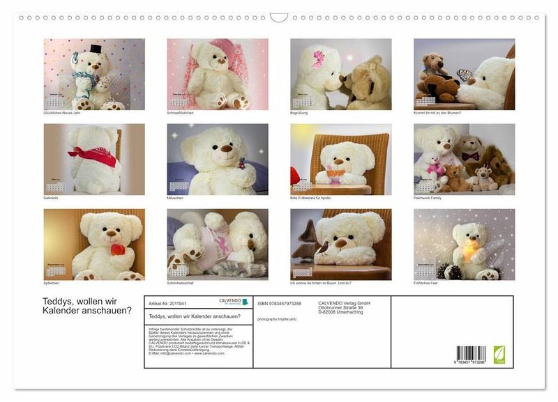 QUALITÄT - Hochwertiger Fotokalender mit 12 wunderschönen Motiven auf lichtbeständigem Bilderdruckpapier, robuste Spiralbindung mit Aufhängebügel.NACHHALTIG - deutliche Abfallreduzierung durch bedarfsgerechte Einzelstückfertigung, umweltfreundliches FSC-zertifiziertes Papier, Produktion in Deutschland, klimabewusste Logistik.PERFEKTES GESCHENK - Kalender für Freunde und Familie, für Kinder und Erwachsene, jung und alt, zu Weihnachten, Geburtstag oder zwischendurch.VIELFALT - Bildkalender in verschiedenen Formaten, z.B. DIN A5, DIN A4, DIN A3 sowie DIN A2. Ob Naturmotiv, Gemälde oder Fotos, ideal für ein persönliches Wohlfühlambiente.Teddys das ganze Jahr von Autor(in): Brigitte Jaritz