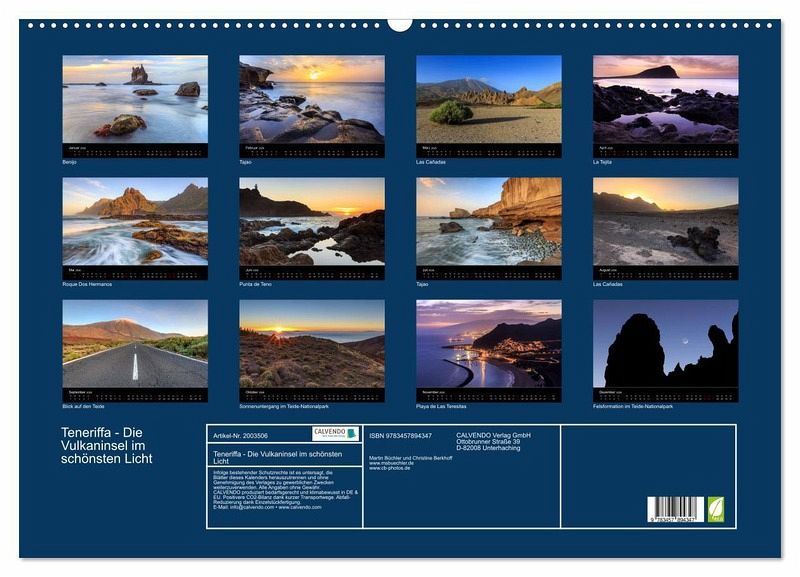Lassen Sie sich entführen auf die Kanareninsel Teneriffa. Bilderbuchstrände zum Sonnenaufgang, malerisch gelegene Ortschaften im Abendlicht, schroffe Felsformationen im Vulkanmassiv - Teneriffa zeigt sich in diesem Kalender von seiner schönsten Seite. 12 beeindruckende Aufnahmen werden Sie durch das nächste Jahr begleiten.
