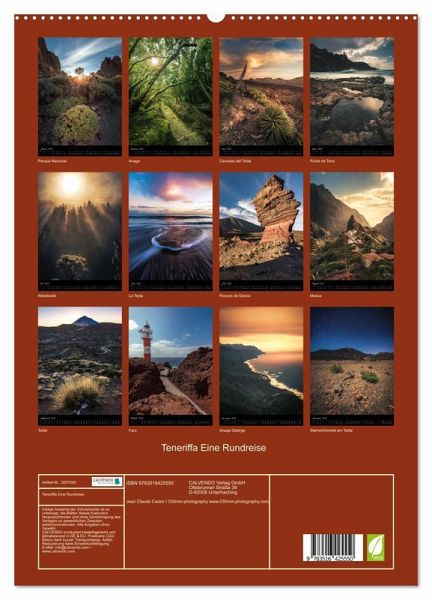 Begleiten Sie den Berliner Fotografen Jean Claude Castor erneut auf einer seiner Reisen. Lassen Sie sich dieses Mal auf die größte und vielfältigste Insel der Kanaren entführen: Teneriffa. Mit seinen kargen Landschaften vulkanischen Ursprungs bis hin zu den saftig grünen Nebelwäldern des Anaga Gebirges, den schroffen Küsten oder zu einladenden Stränden bietet die Insel inmitten des Atlantiks zauberhafte Kulissen, festgehalten in diesem einmaligen Kalender.