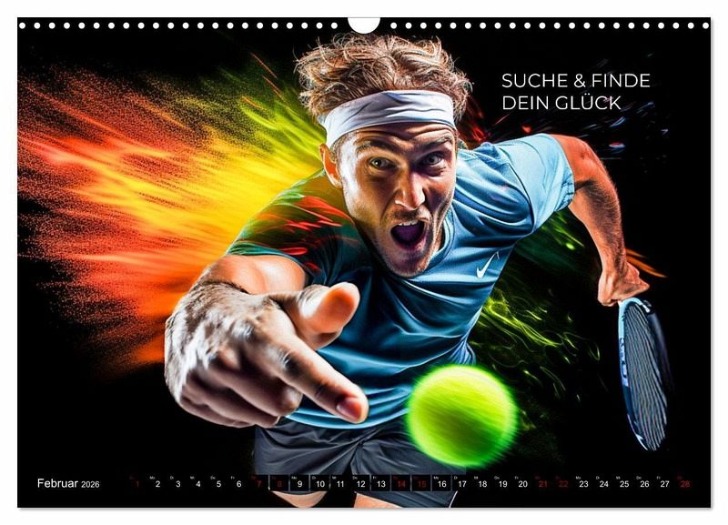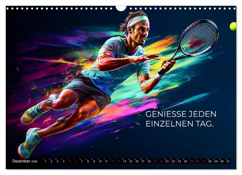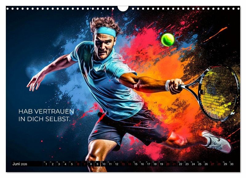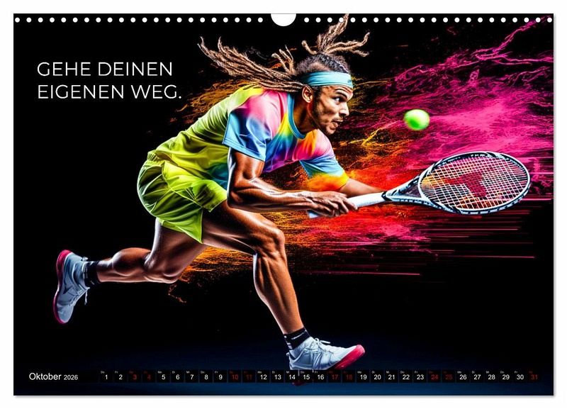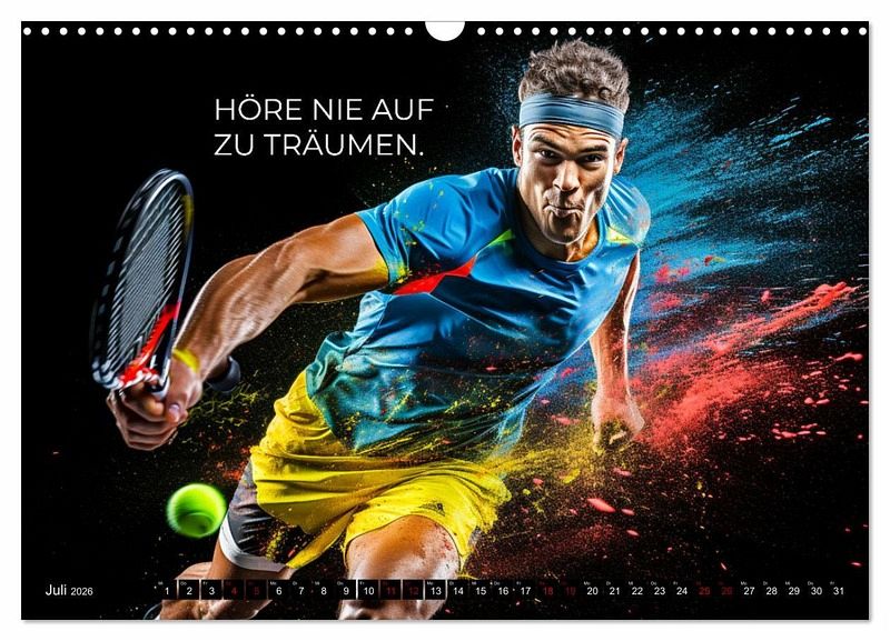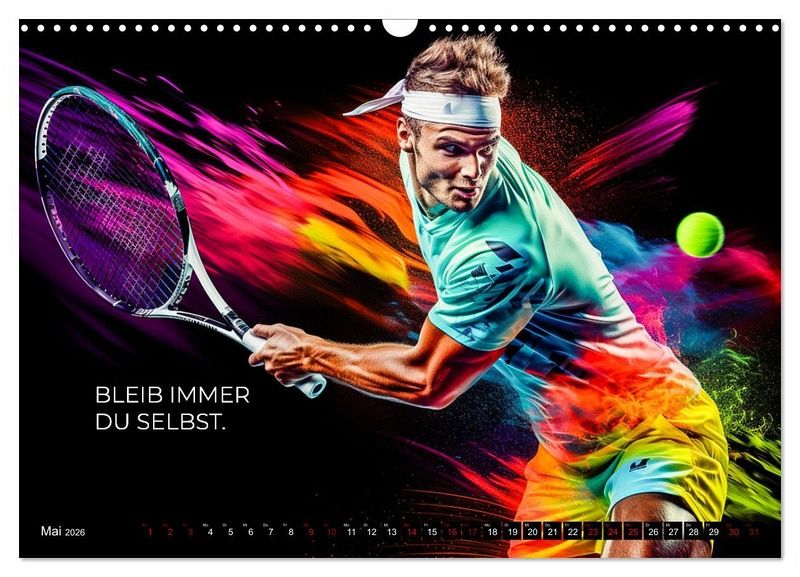 Erlebe das Jahr voller Power und Inspiration mit unserem einzigartigen Wandkalender 'Tennis & Motivation' - das perfekte Geschenk und Mitbringsel für alle Tennisfans und Sportbegeisterten! Unsere hochwertigen Bilder fangen die Dynamik des Spiels ein und lassen dich das Adrenalin auf dem Platz spüren. Gleichzeitig sorgen die motivierenden Sprüche dafür, dass du das ganze Jahr über deine Ziele nicht aus den Augen verlierst. Ob du selbst ein leidenschaftlicher Tennisspieler bist oder jemanden kennst, der den Sport liebt, unser Wandkalender 'Tennis & Motivation' ist das ideale Geschenk für jeden Anlass. Geburtstage, Feiertage oder einfach als Überraschung zwischendurch - dieser Kalender zaubert jedem Tennisfan ein Lächeln ins Gesicht.Sichere dir jetzt unseren 'Tennis & Motivation' Wandkalender und genieße 12 Monate voller Energie, Leidenschaft und Inspiration. Zeige deine Liebe zum Tennissport und motiviere dich oder deine Lieben mit diesem besonderen Geschenk. Bestelle noch heute und freue dich auf ein Jahr voller sportlicher Triumphe und positiver Energie! Erstellt wurden die Bilder im übrigen mit KI und Photoshop.